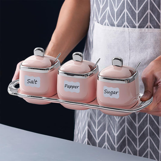 Ceramic Sugar Bowls Set Salt Containers Condiment Jar Porcelain Spice Pots Pepper Boxes with Lids and Spoon, Kitchen Seasoning Canister for Pepper, Sugar, Salt (Pink)