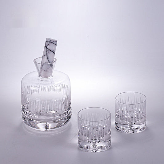 Carved Art Glass Wine Decanter and 2 Cup Set
