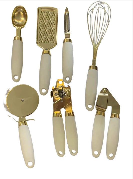 White & Gold Kitchen Tools and Gadgets - Luxe 7PC Cooking Tools and Gadgets with Anti-Slip Handles, Gold Utensils Set, Gold Kitchen Accessories,Premium Kitchen Gadget Set (Champagne gold & white)