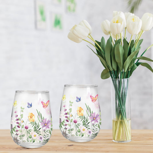 Whaline 2Pcs Spring Stemless Wine Glasses 17oz Watercolor Floral Butterfly Drinking Glasses Wild Flower Tumbler Cups for Party Supplies Gifts