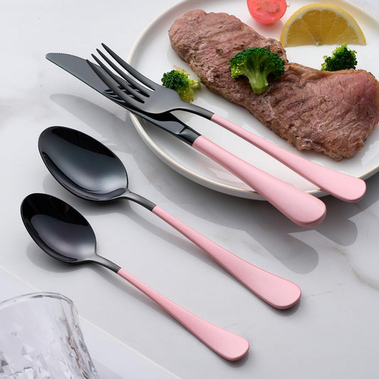 Black and Pink 20-Piece Silverware Set 18/0 Stainless Steel Flatware Warm Pink Handle Cutlery Set Service for 4 Dinner Knives Forks Spoons Set Mirror Finish Dishwasher Safe