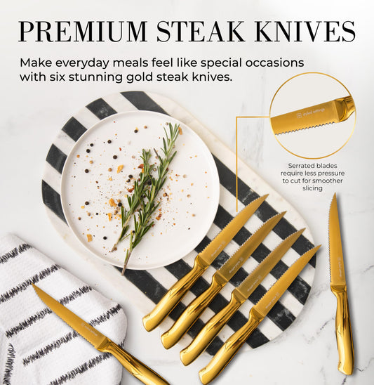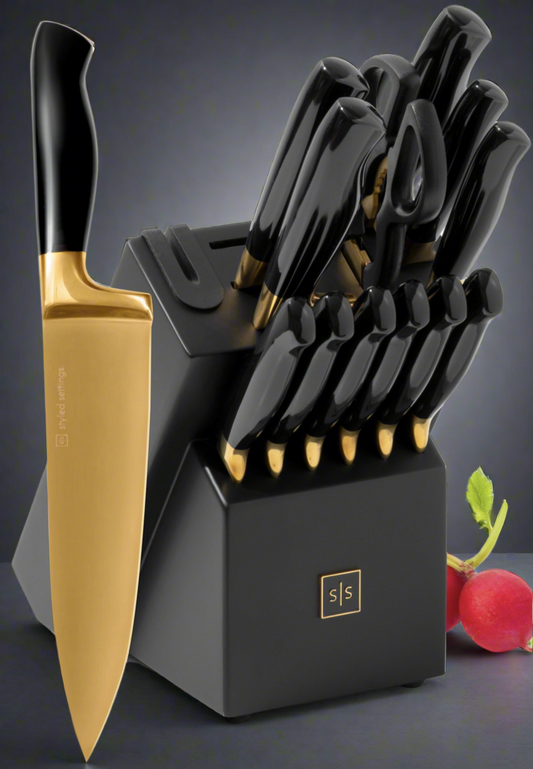 Black and Gold Knife Set with Block – 14-Piece Ultra-Sharp Full Tang Knives with Self-Sharpening Knife Block – Stylish Black and Gold Kitchen Accessories and Decor
