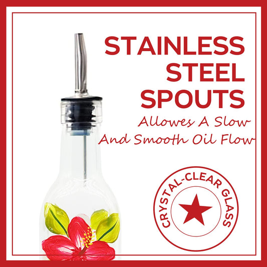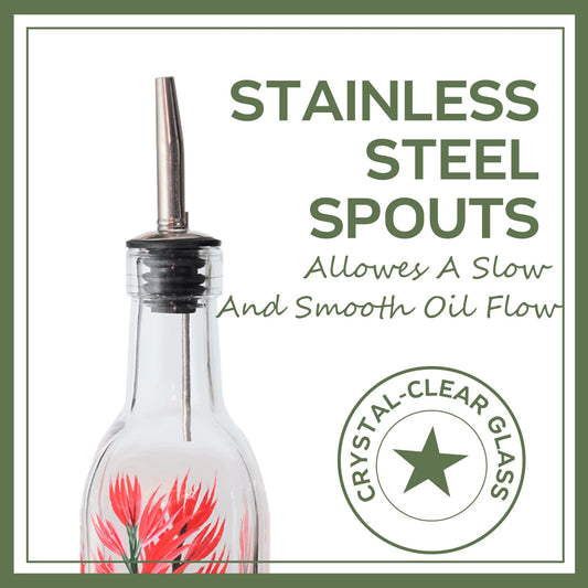 YIYUKODO 17oz Hand Painted Glass Olive Oil Bottle - 500ml Green Oil & Vinegar Cruet with Pourers - Olive Oil Carafe Decanter for Kitchen (Red flowers)