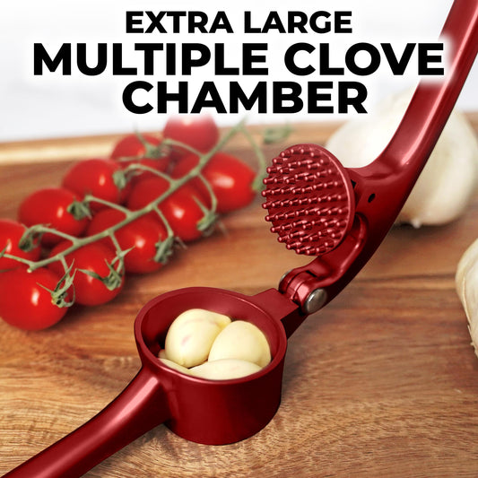 Zulay Kitchen Large Premium Garlic Press Set - Bigger Bowl for Bigger Garlic - Rust Proof and Dishwasher Safe Garlic Mincer Tool - Easy-Squeeze, Easy-Clean Silicone Garlic Peeler and Brush (Red)