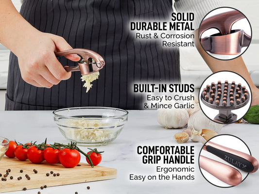 Zulay Kitchen Premium Garlic Press Set - Rust Proof and Dishwasher Safe Professional Garlic Mincer Tool - Easy-Squeeze, Easy-Clean with Soft, Ergonomic Handle - Silicone Garlic Peeler and Brush (Copper)