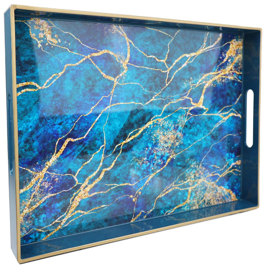 Vibrant Blue and Gold Marble Decorative Plastic Serving Trays with Handles for Living Room, Coffee Table, Ottoman, Bathroom, Kitchen, Large 15.7”*11.8”*1.6"