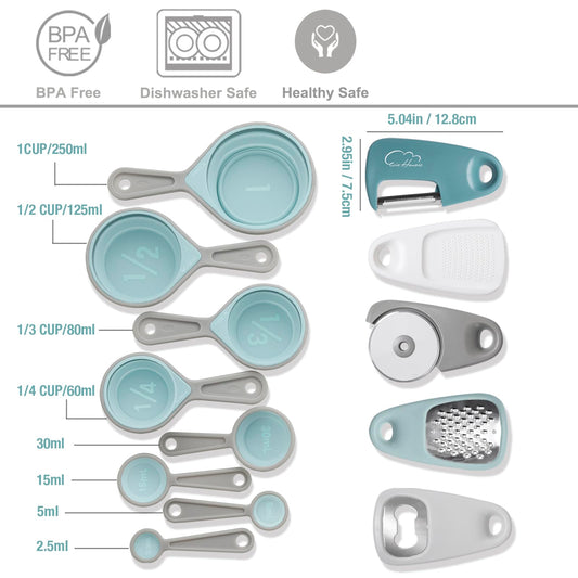Kitchen Gadgets Set 13-Piece, Space Saving Cooking Tools Includes Cheese Grater, Pizza Cutter, Peeler, Bottle Opener, Garlic Grinder, Collapsible Measuring Cups Spoons for Small Kitchen RV Camp