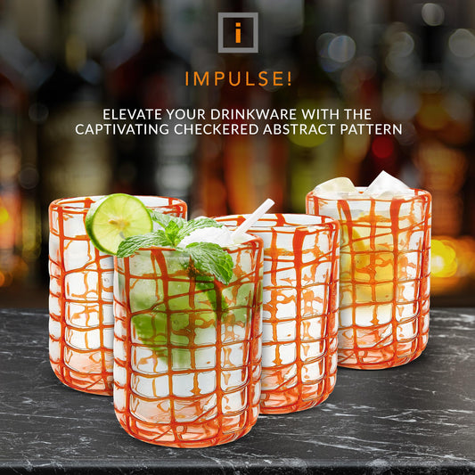 IMPULSE! Checkered Abstract Orange Drinking Glasses Set of 4 - Classic Old Fashioned, Negroni, Scotch, Mixed Cocktails - Versatile for Soft Drinks - Dishwasher Safe - Drinkware Glasses Set