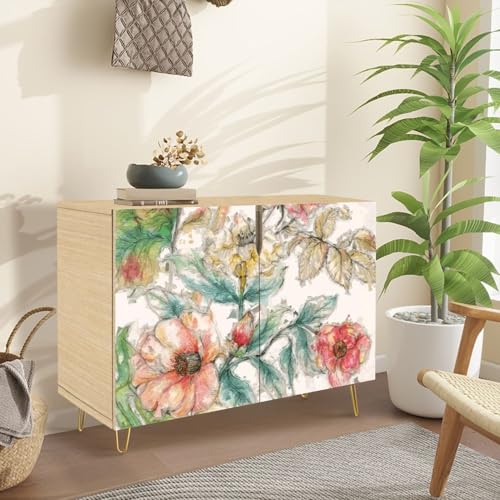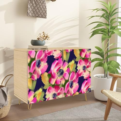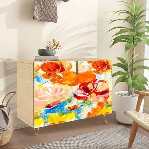 Mid-Century Sideboard Buffet Kitchen Storage Cabinet with 2 Doors Artistic floral seamless pattern Bright flowers hand drawn oil paints Cupboard Console Table Bar Cabinet for Dining Room Hallway