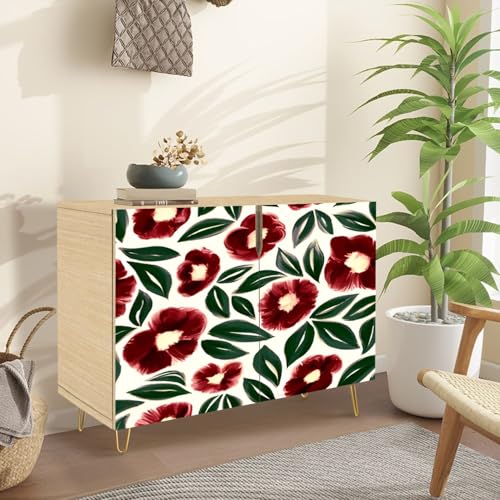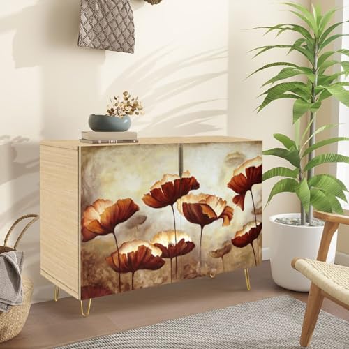 Mid-Century Sideboard Buffet Kitchen Storage Cabinet with 2 Doors Seamless Pattern Abstract red Flowers Original Hand Drawn Cupboard Console Table Bar Cabinet for Dining Room Hallway
