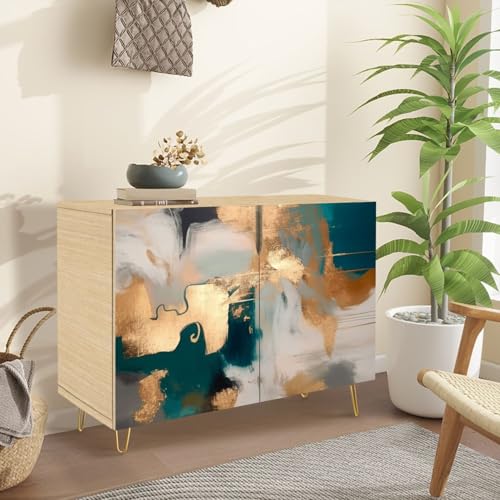 Mid-Century Sideboard Buffet Kitchen Storage Cabinet with 2 Doors Hand drawn oil Abstract artistic Oil canvas golden texture Fragment Cupboard Console Table Bar Cabinet for Dining Room Hallway