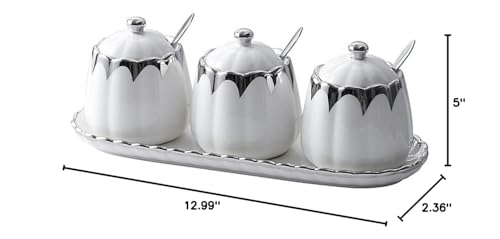 Magnitt Porcelain Condiment Jar Spice Container with Lids, Spoon and Tray, Set of 3,Modern Spice Box Seasoning Jar for Your Home, Kitchen, Counter (White silver)