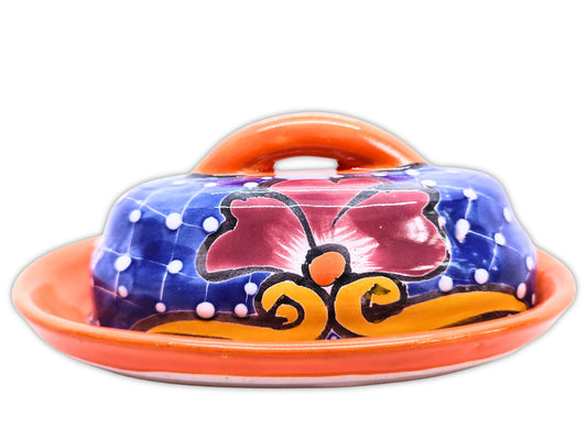 MEXTEQUIL - Butter Dish Ceramic Talavera with Lid Hand Painted Authentic Mexican Pottery Kitchen Floral Design (Orange)