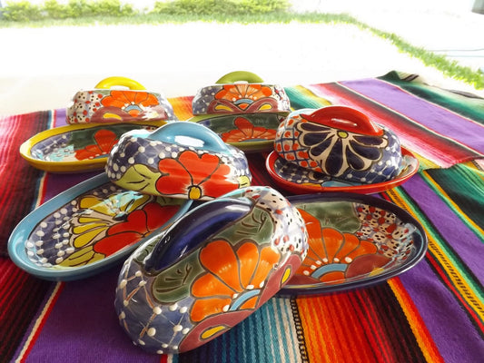 MEXTEQUIL - Butter Dish Ceramic Talavera with Lid Hand Painted Authentic Mexican Pottery Kitchen Floral Design (Green)