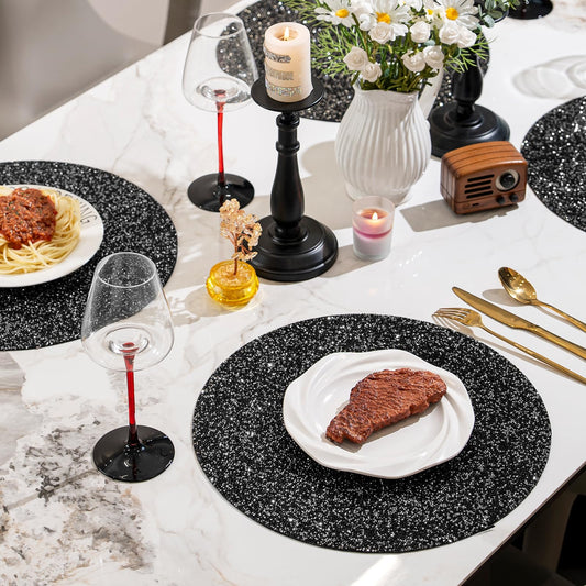 Cumouna Black Placemat Sparkle Crushed Rhinestones Round Washable Elegant Glitter Table Mat for Fall Halloween Wedding Christams Kitchen Home Decor Housewarming Gifts (15 Inch)