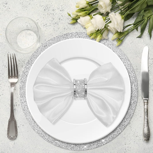 Suclain 4 Set Crushed Diamond Silver Napkin Rings Rhinestone Placemats Set Napkin Rings Holder Silver Crushed Rhinestone Placemats 13 x 13'' for Wedding Party Dinner Table Decoration