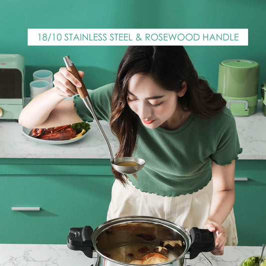18/10 Stainless Steel Kitchen Utensils Set with Wood Handle - 15” Metal Cooking Tools and Serving Utensil, 8-Pieces Cooking Spoons Set - Spatula, Ladle, Skimmer, Turner, Pasta, Solid Spoon, Slotted Spoon