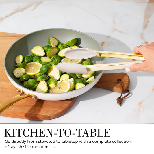 7-Piece Beige and Gold Kitchen Utensils Set – Non-Toxic Silicone and Stainless Steel Tools for Cooking, Serving, and Hosting – Ideal for Nonstick Cookware and Modern Kitchens, with Gold Utensil Holder