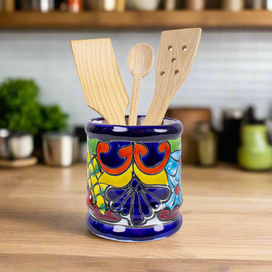 Handmade Mexican Talavera Ceramic Utensil Holder (Flowers)