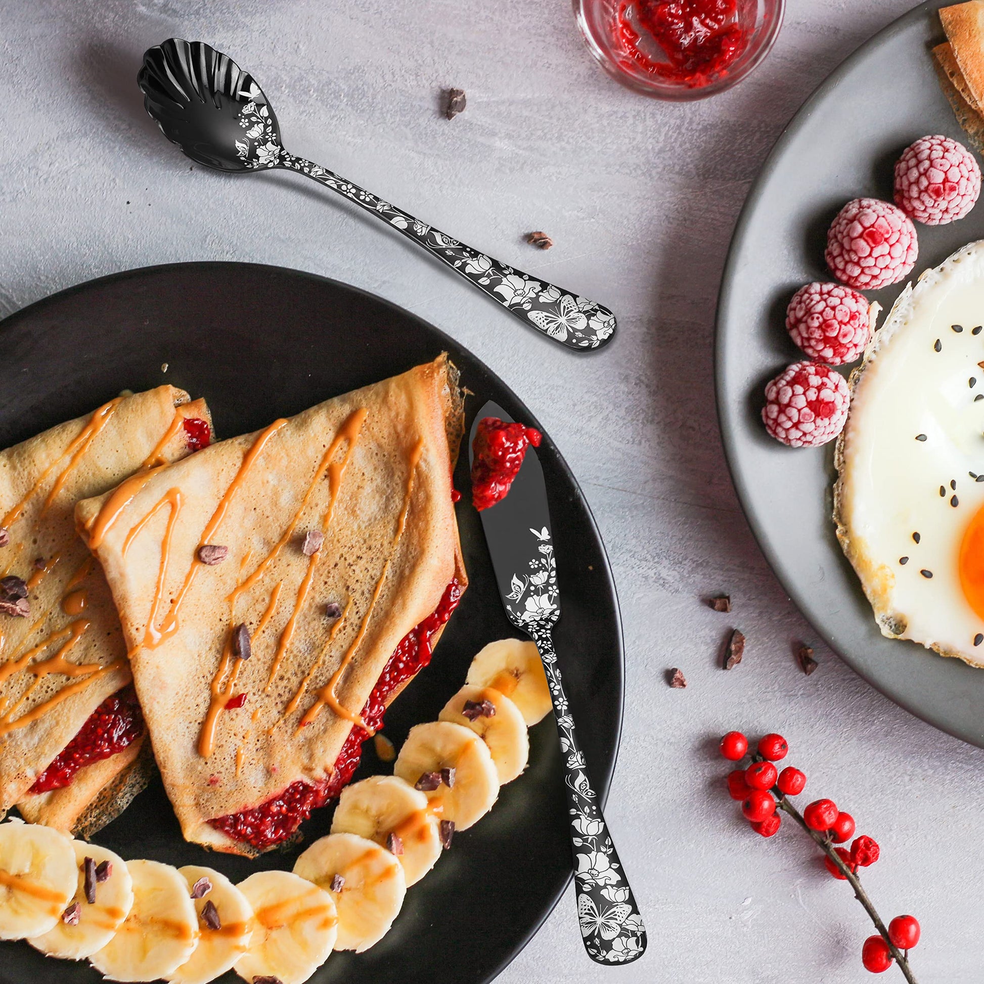 - Unique Pattern Design - Our silverware sets are designed with beautiful laser print of butterflies with flowers, unique styles make your dining table special, standing out from the ordinary tableware, stylish shape with black finish, creates an elegant, noble and luxurious dining scenes.