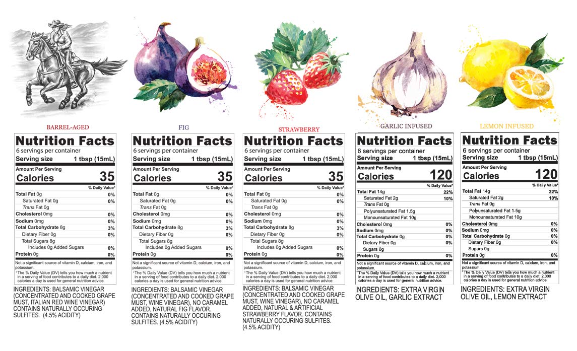 - 5 100 ML Bottles of our finest gourmet flavors: Barrel Aged Balsamic, Fig Balsamic, Strawberry Balsamic, Lemon Infused Olive Oil, Garlic Infused Olive Oil