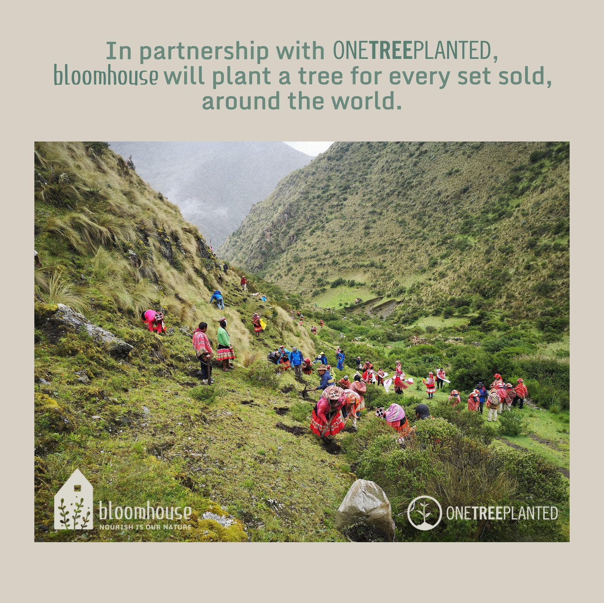 - ONE TREE PLANTED PER SET SOLD: bloomhouse is proud to partner with ONETREEPLANTED to plant a tree for every dinnerware set sold.
