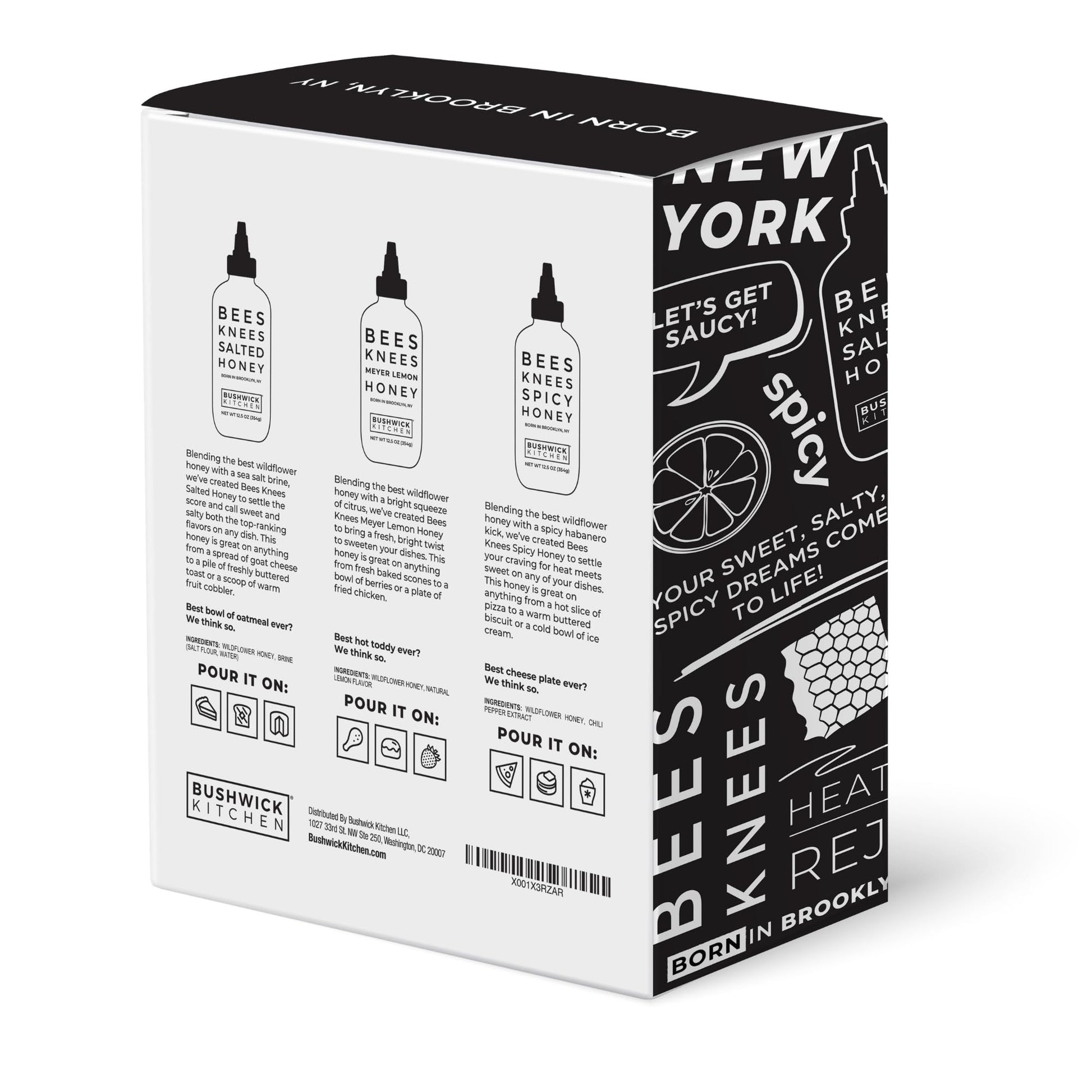 Bushwick Kitchen Bees Knees Honey Sampler Gift Box, Set Includes Spicy Honey, Meyer Lemon Honey, Salted Honey Sauces, Honey Inspired Recipes, Bushwick Kitchen Tea Towel, and Ready-to-Gift Box