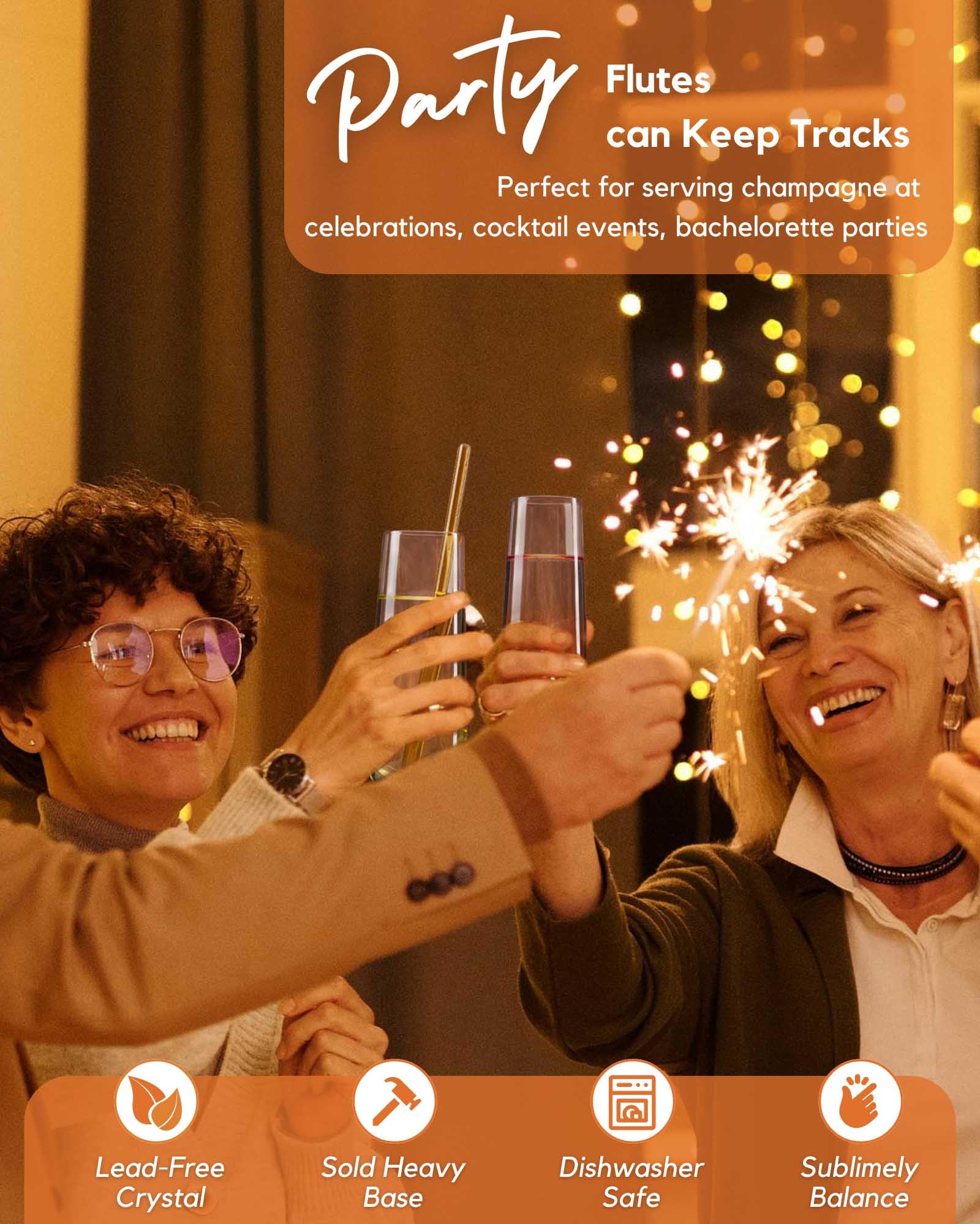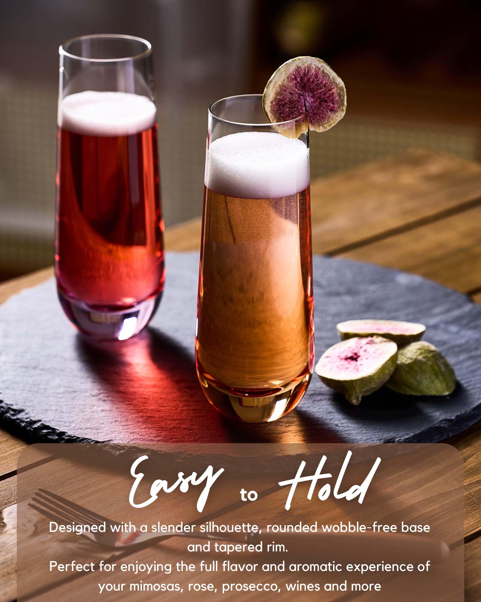- SATISFYING- WINE FLUTES: The crystal MIMOSA flutes show the brilliance, clarity and delicacy of fine crystal(lead-free) for elevated sipping of your favorite bubbly(champagne cocktails, Prosecco, sparkling rosÃ, everyday Cava, spritz cocktail and flavored seltzer water) —without the worry. Sturdy, Pretty and Gorgeous glassware accessories for your home bar