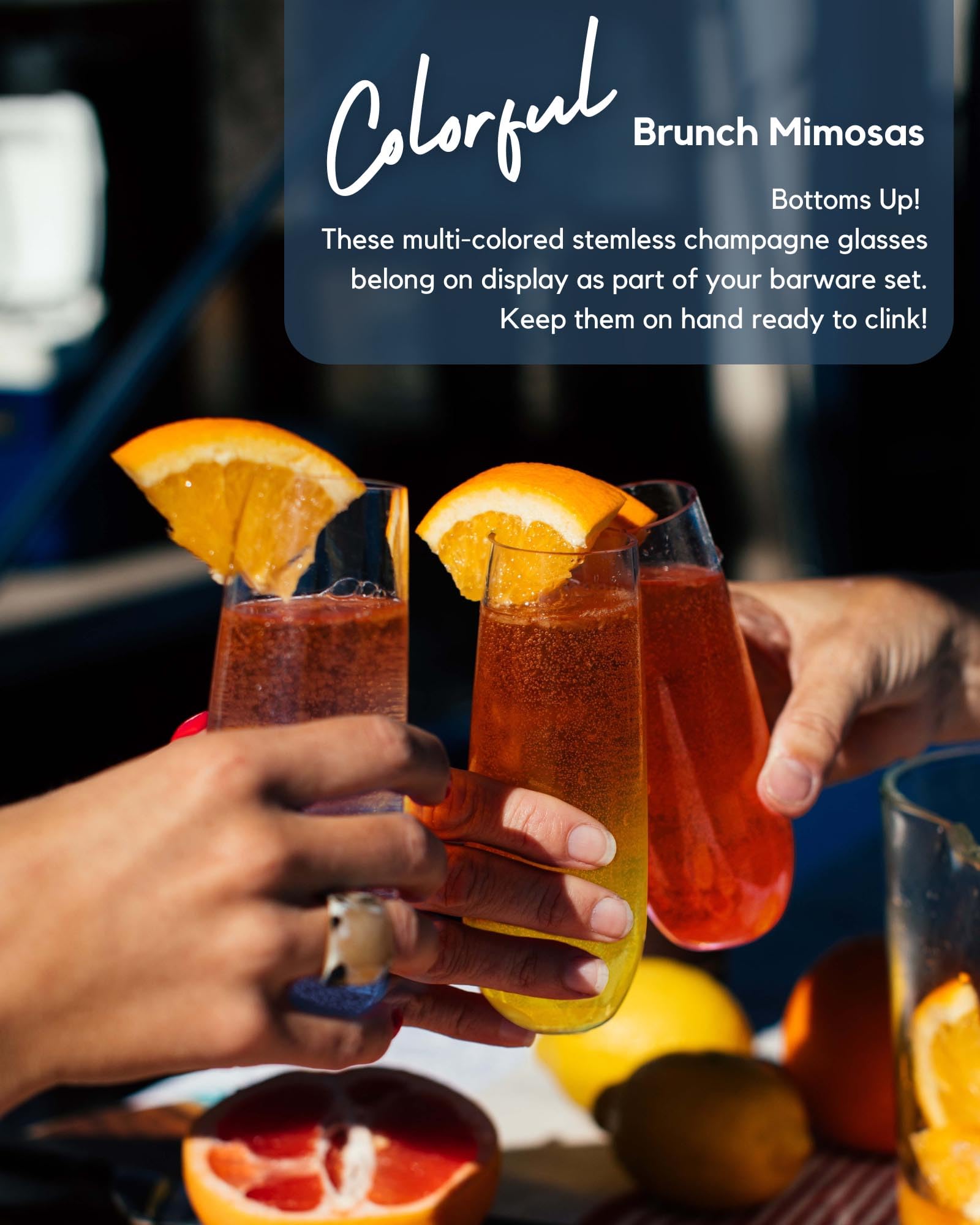 ColoVie Stemless Champagne Glasses Set of 6- Colored Champagne Flutes- Wedding Toasting Glass- Bridesmaid Gift- Mimosa Glass- Crystal Bar Glassware- Birthday Cocktail Party, 9.6oz