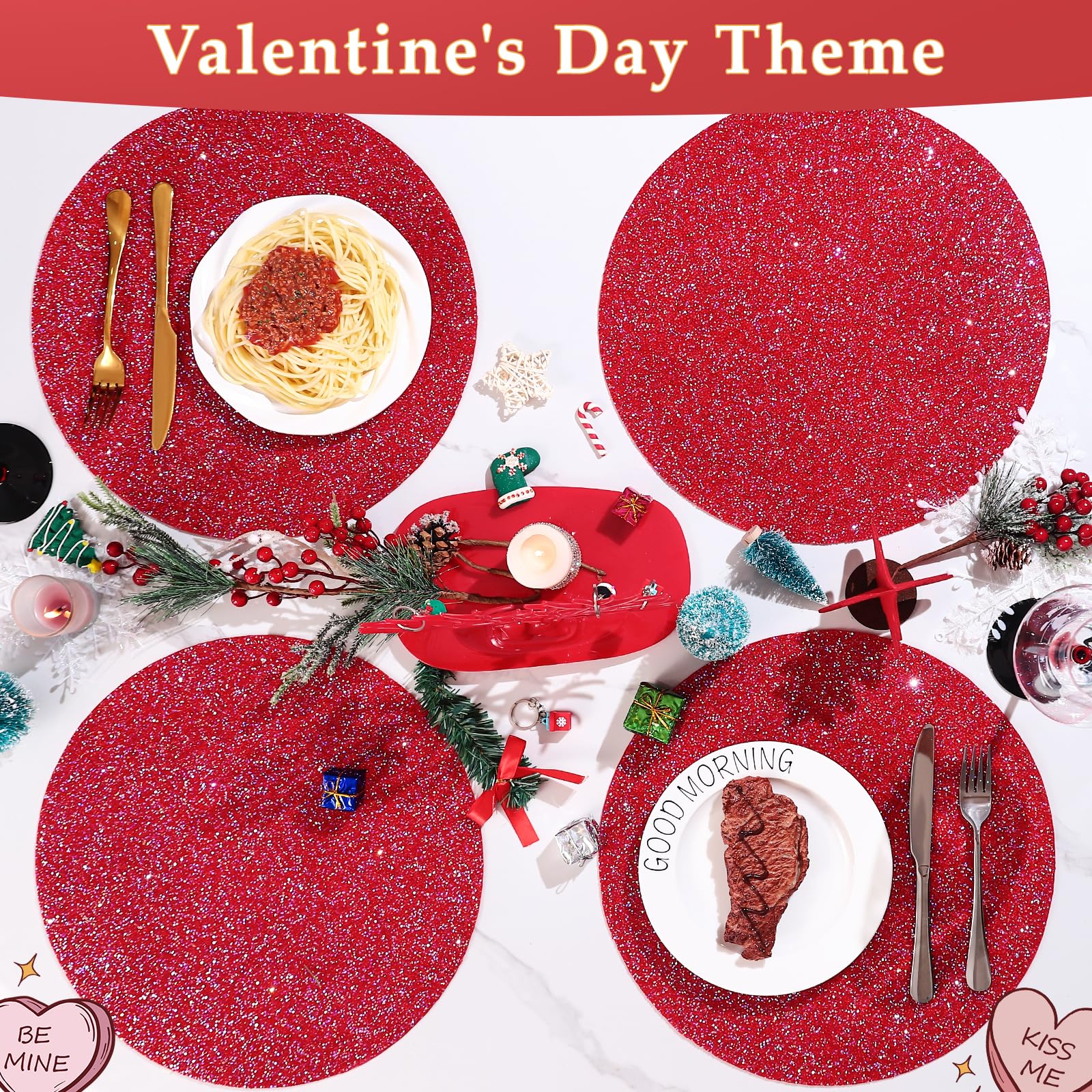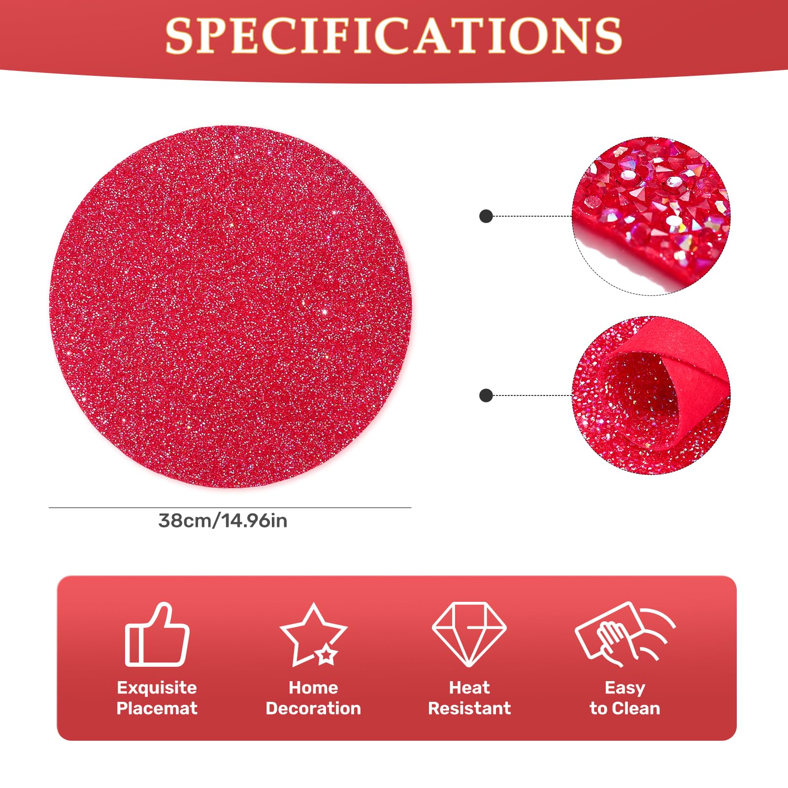 - Red Rhinestones Round Placemat:Cumouna placemats are perfect for kitchens, hotels, restaurants, banquets, birthdays,Valentine's Day, housewarmings, holidays, parties, family gatherings, weddings, and more.