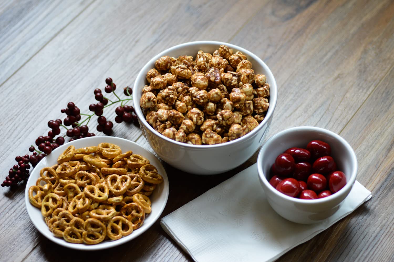 - 2 Dan’s Original Summer Sausage (10oz), 2 Roasted Garlic Red Pepper Sausage (10oz), Party Nut Tray assortment (22.9oz), Cinnamon Roll Crunch Popcorn & Almond Crunch Popcorn (7.5oz ea), Dan’s Addiction Granola (3.8 oz), Mini Pretzel Twists (2.9oz), Wisconsin Cheddar (6oz), Wisconsin Swiss Bar (4oz), 2 each of Dan’s Sweet Hot Mustard and Grainy Dijon Mustard (1.75oz each), Italian Stuffed Olives (2.2oz), 2 boxes of Water Crackers, Alder Smoked Salmon (2oz), and Red Chocolate Cherries (2.3oz).