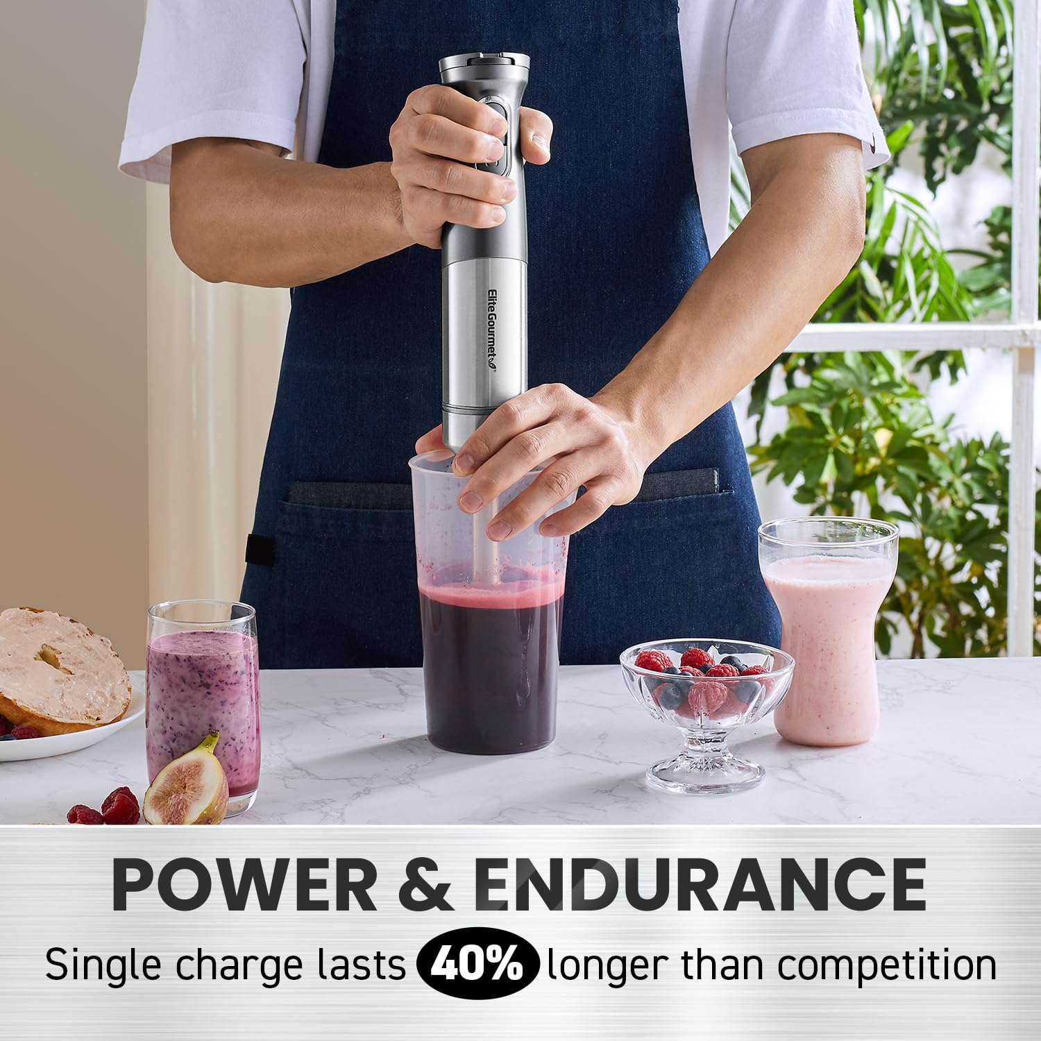 Elite Gourmet EHB1324 Cordless, Rechargeable Hand Blender, Variable 5-Speed Blending, One-Touch Power Button & Safety Lock, Stainless Steel Blades, Portable, Sauces, Soup, Smoothies, Baby Food, Gray