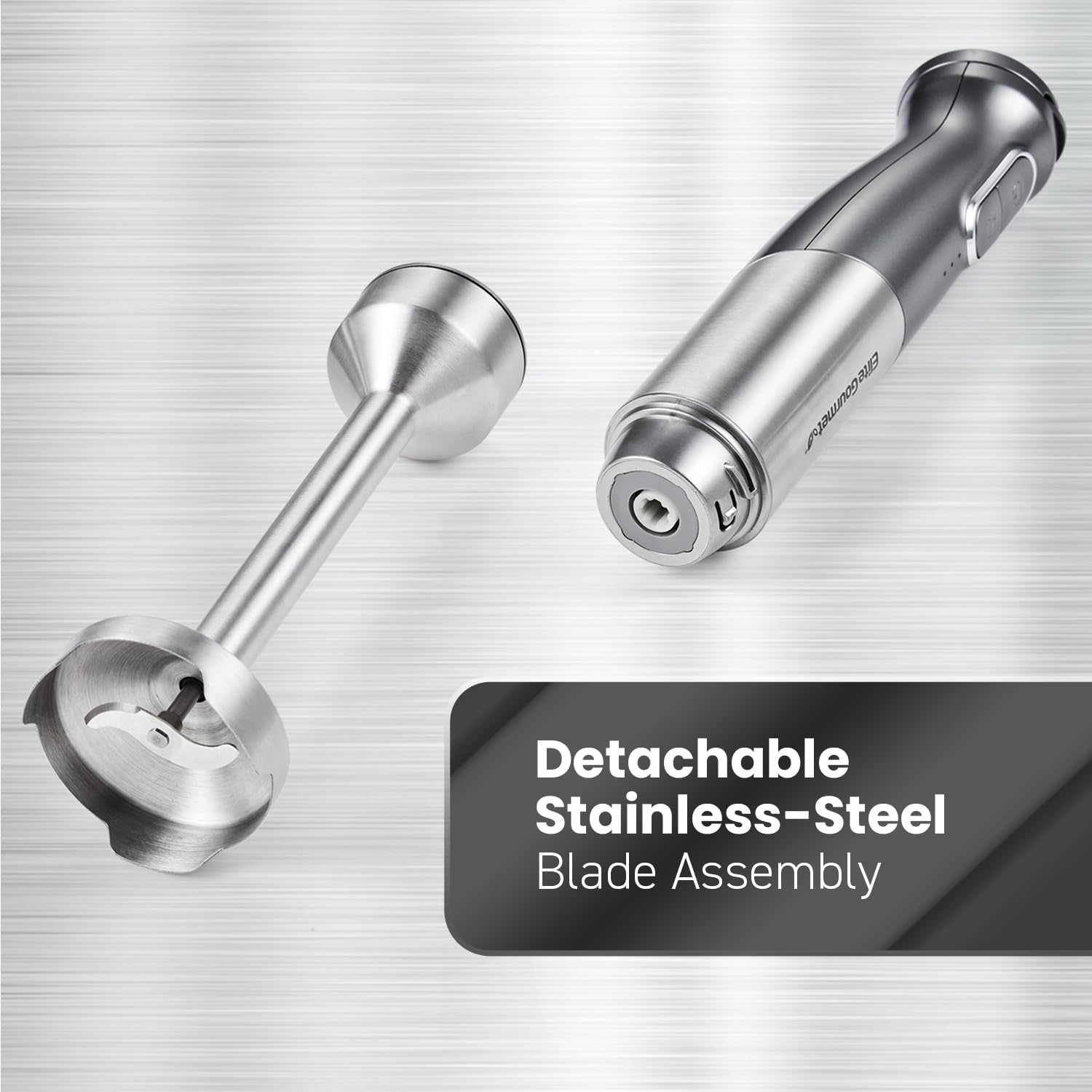 - POWERFUL, CORDLESS & COMPACT: The powerful and versatile cordless rechargeable immersion hand blender can be used for up to 30 minutes (depending on viscosity of blended foods) and features variable 5-speed control, stainless-steel blades for perfect blending results in or out of the kitchen and a power button safety lock.