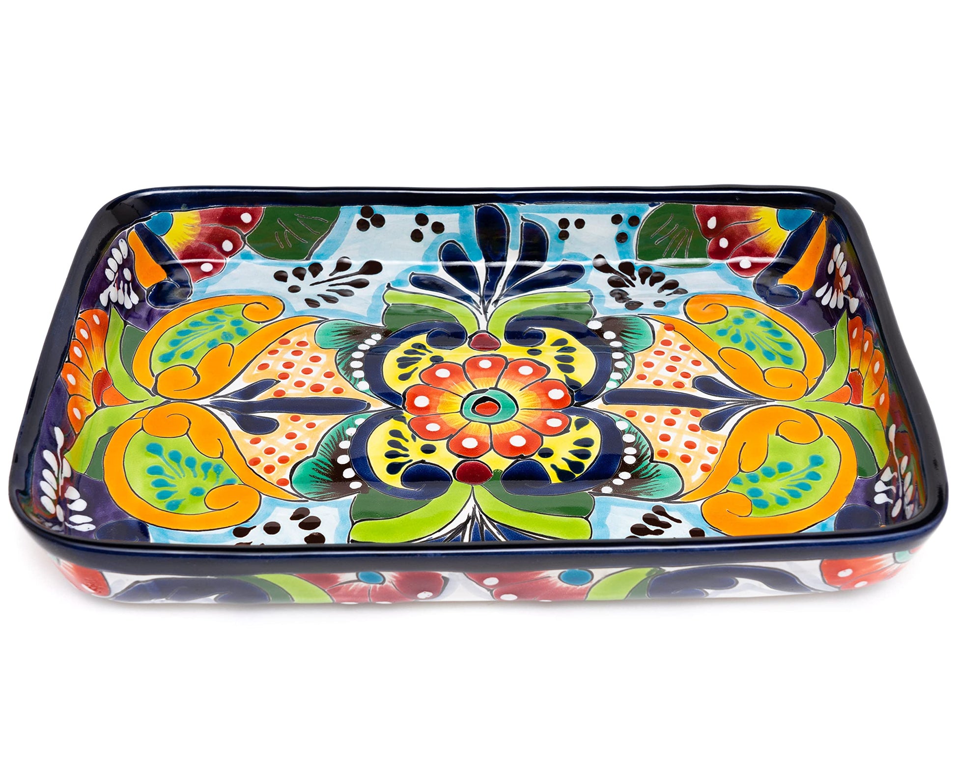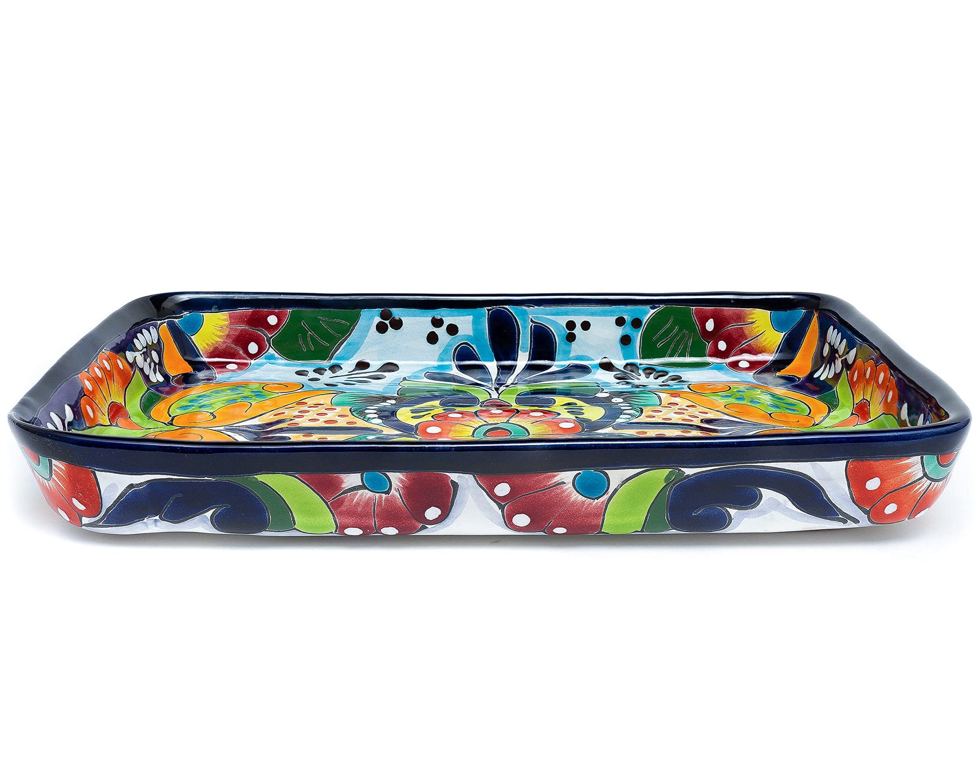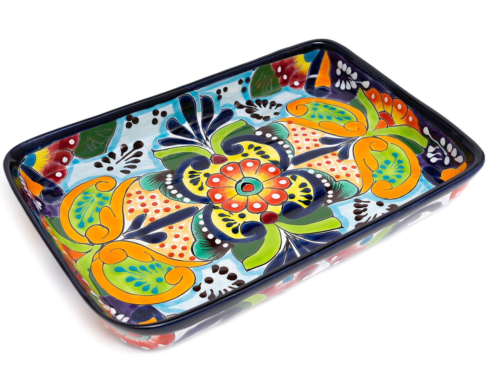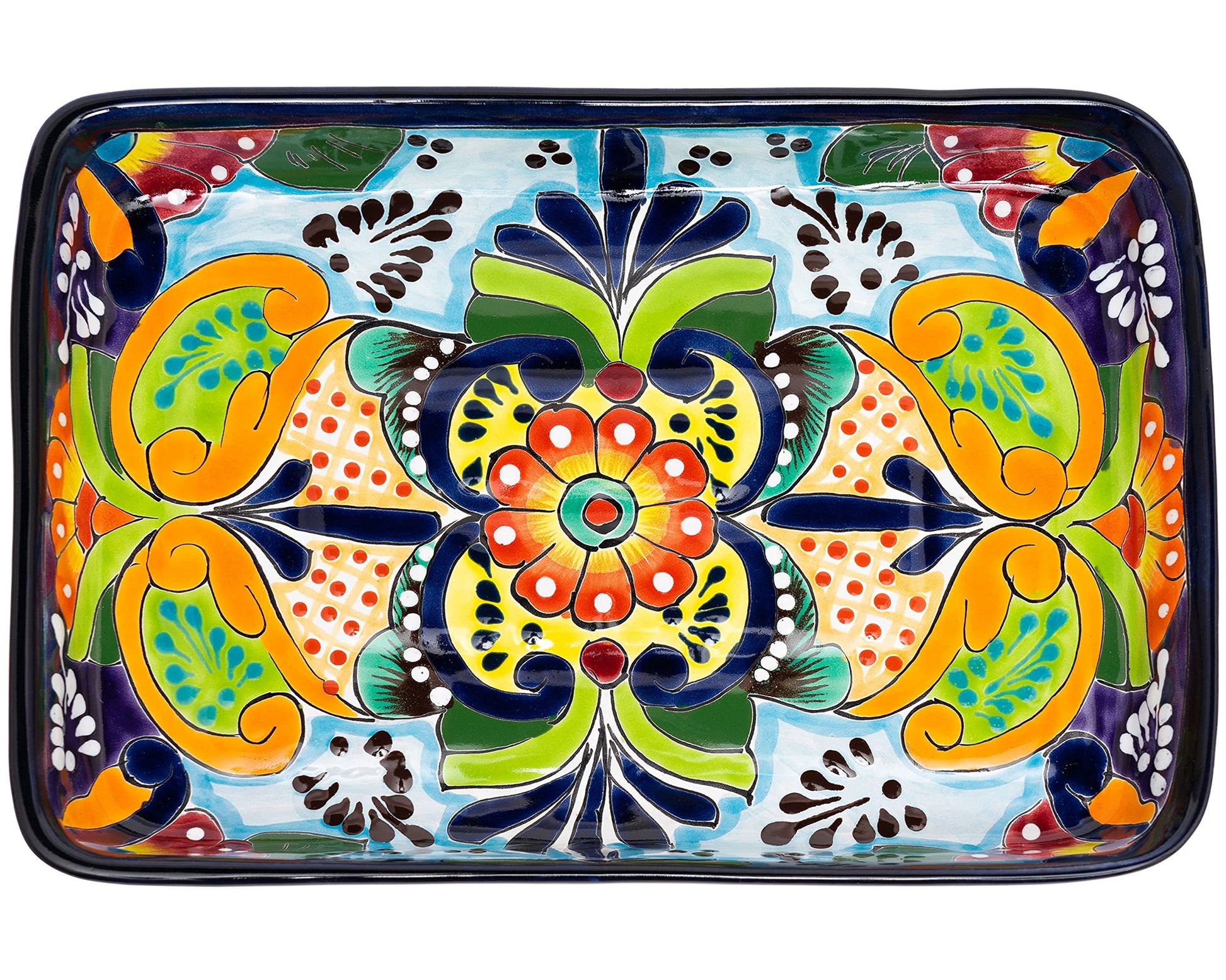 - SIZE & QUALITY: Ceramic handcrafted traditional Mexican serving platter measures 13.2” in length, 9" in width and 2" high. Perfect for serving all types of foods for a festive pop of color to any table. Handmade from start to finish using high-quality lead-free materials resulting in a heavy-weight piece to prevent tipping and last a lifetime.