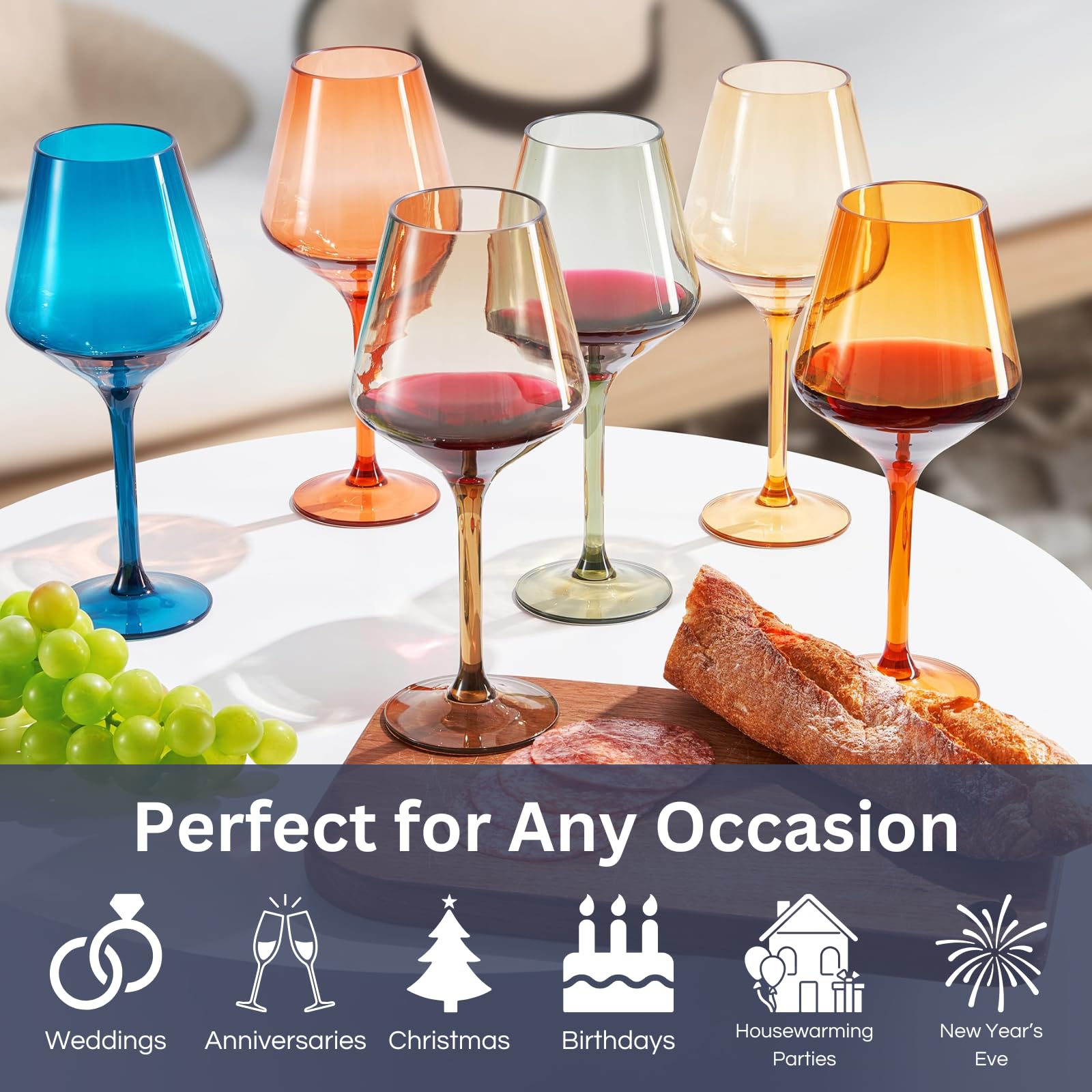 - SOFT MUTED COLORS FOR A TOUCH OF STYLE: Each glass in this set features a beautiful muted color that adds subtle charm to your drinkware collection. The gentle hues not only add a unique touch of style but also make it easy to assign a glass to each guest, reducing mix-ups. These muted colors bring a modern aesthetic to the classic wine glass shape, blending seamlessly with any decor and adding a touch of color to any gathering.