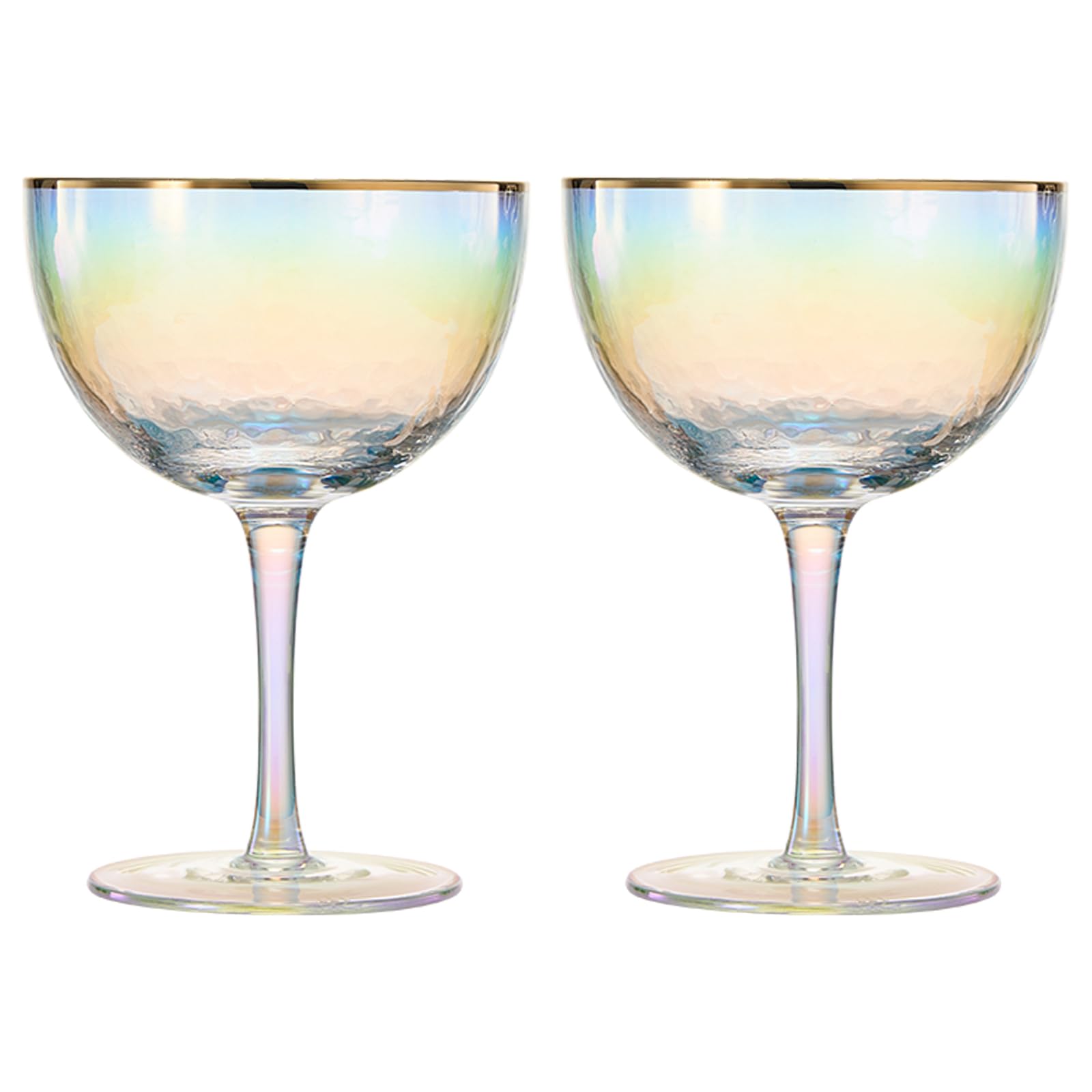 - The Iridescent Hammered Coupe Champagne Glass features a mesmerizing iridescent finish that catches and reflects light, creating a stunning display of colors. The hammered texture adds depth and dimension to the glass, while the delicate gold rim adds a touch of elegance. This combination of unique design elements makes these glasses not only a beautiful choice but also a captivating conversation starter.