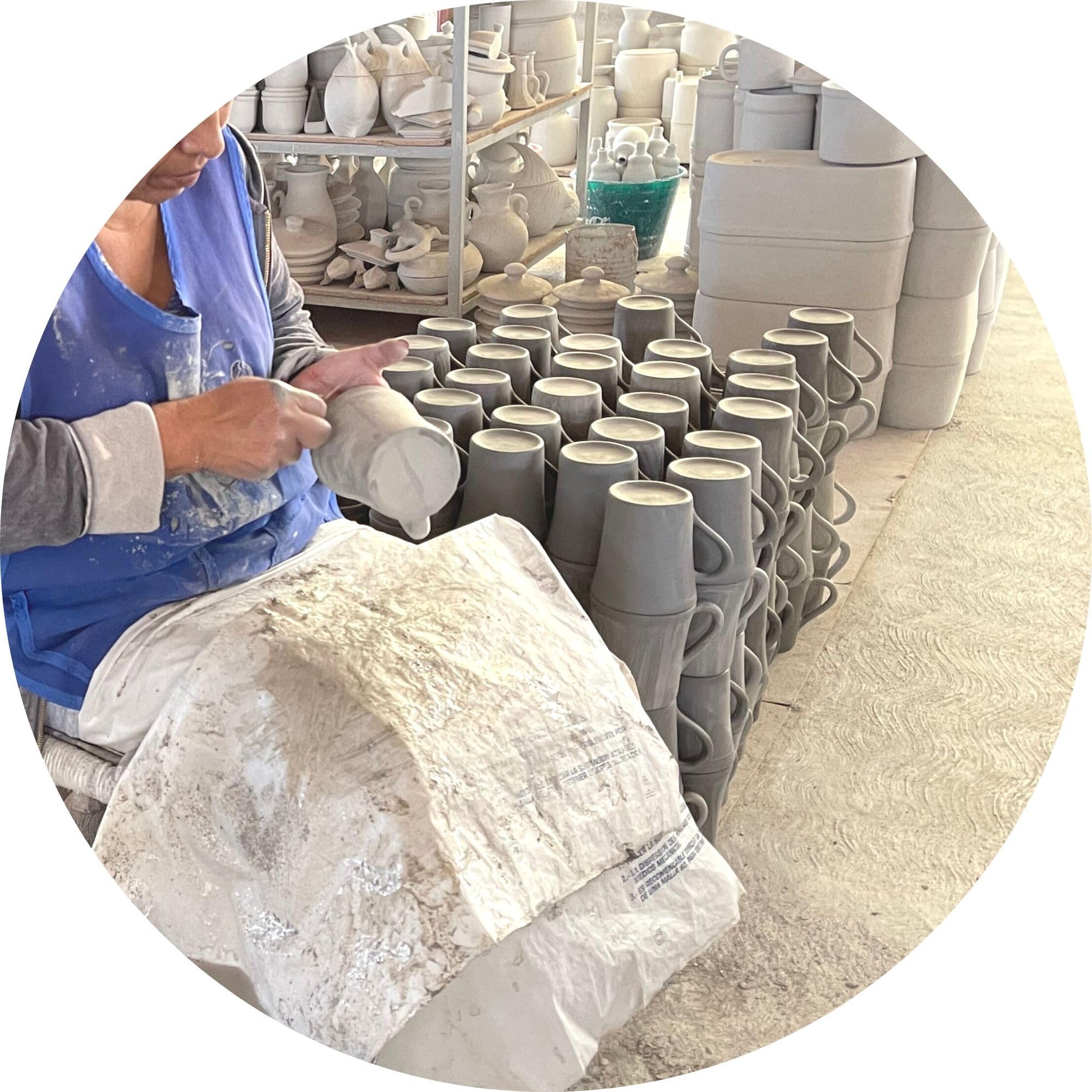Details: Lead-free, dishwasher and microwave safe, this richly-colored mug shaped like a beaker is handcrafted and painted by Mexican artisans. While a very functional piece, the outside, inside, and handle are covered with a textured pattern making each piece unique. 4 inches tall. About the Maker There’s no sign to find the small family-owned ceramic workshop in the state of Guanajuato. Behind the large wooden gate, women artisans are hand painting unfired ceramics while men work the kilns, as they have since the late 70’s. Each piece has personality from the dots and swirls to the handpainted logo on the bottom. And each is lead free, microwave and dishwasher safe.