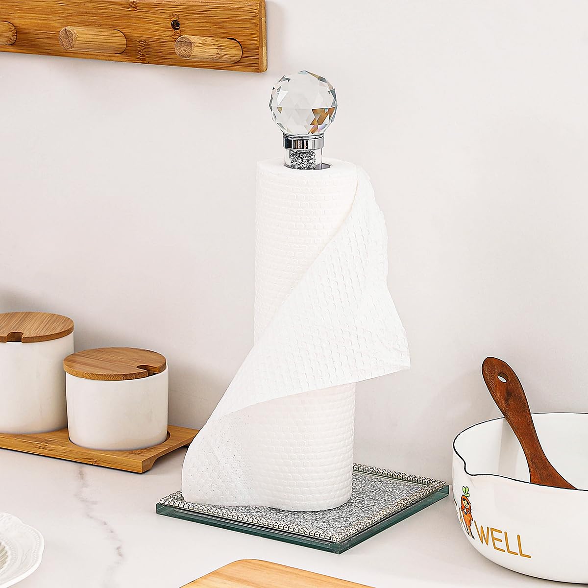 - [Features: This is a stunning eye catching, yet practical paper holder. It will hold any kitchen towel/roll well. A total statement piece which is perfect for entertaining. The crystal dome at the top is brimming with sparkling crystals and the base is a little wider than others, easy to tear paper with one hand. The large end cap can prevent paper stand from jumping out when tearing.