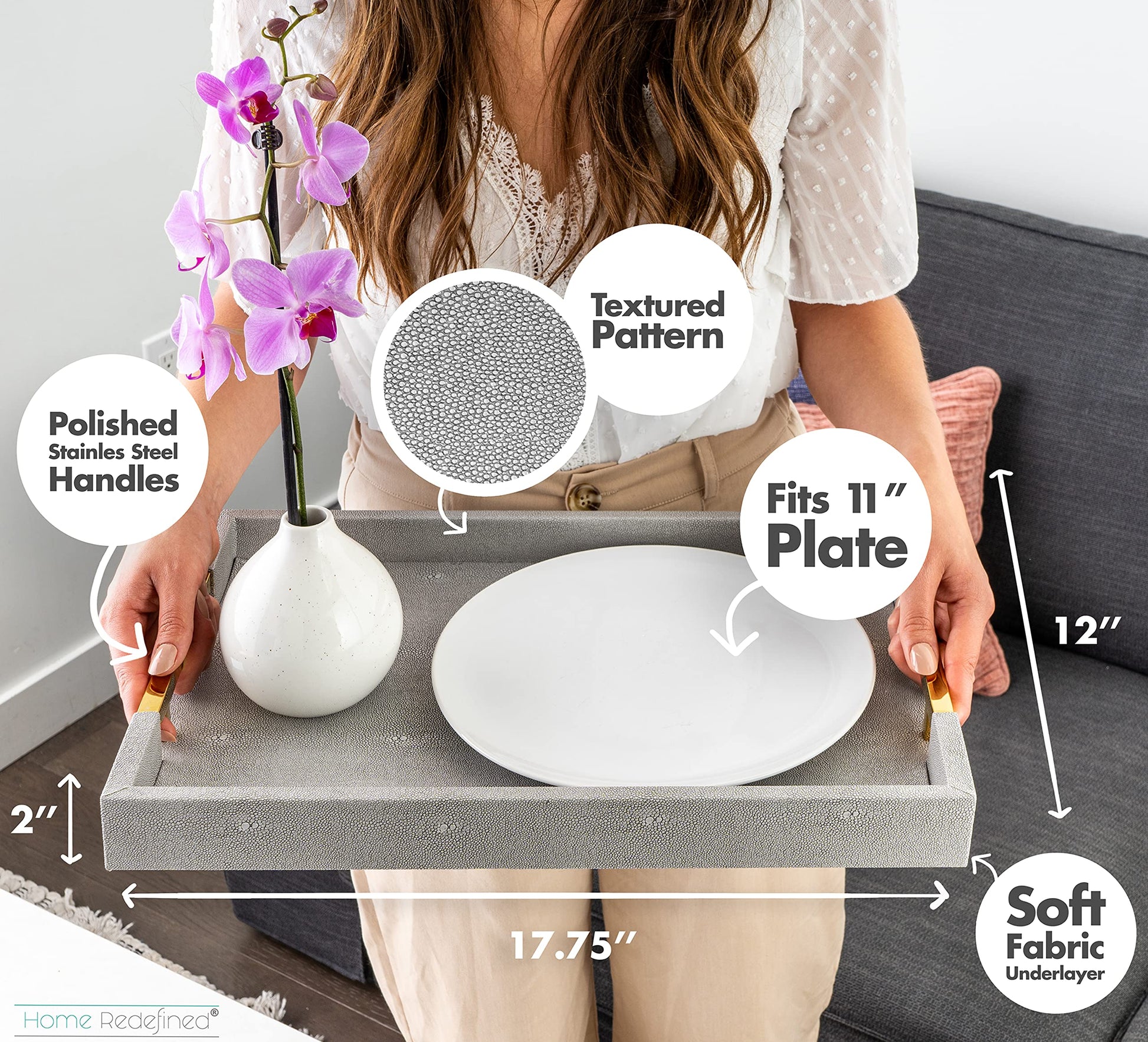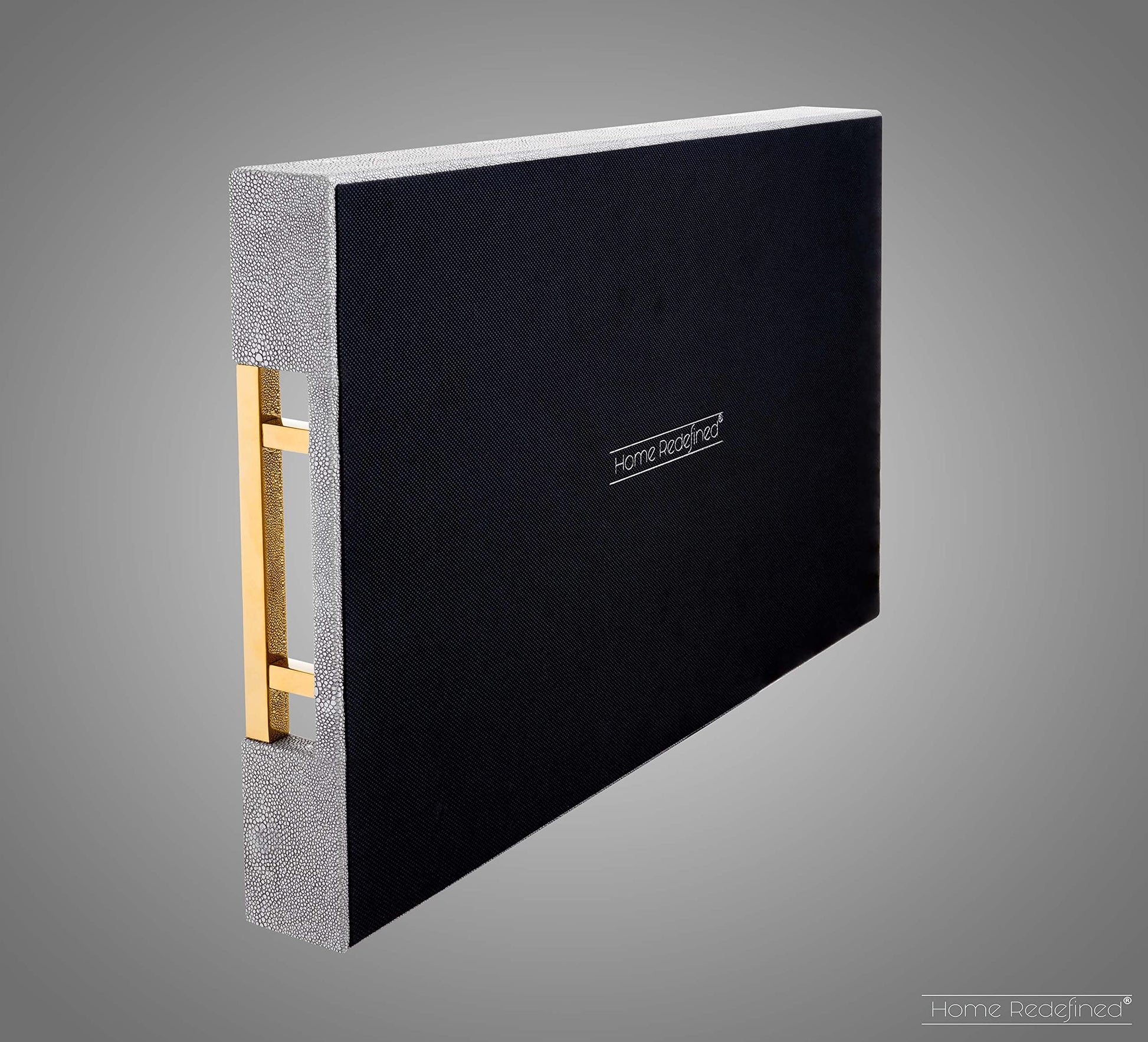 Home Redefined Modern Elegant 18"x12" Rectangle Glossy Grey Shagreen Faux Leather Tray Decorative Tray Ottoman Tray Coffee Table Perfume Kitchen Serving Tray with Gold Polished Metal Handles.