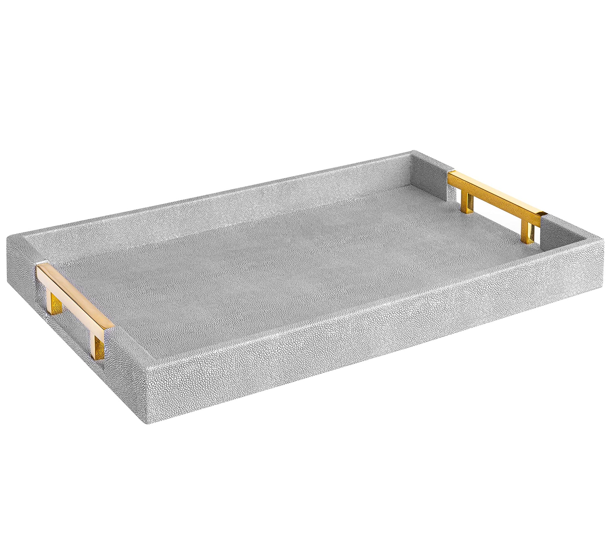 - DECORATE & ORGANIZE YOUR HOME: Eye catching modern glossy faux leather grey shagreen decroative serving tray with 201 polished gold stainless steel metal handles, the perfect addition to your home or office space.