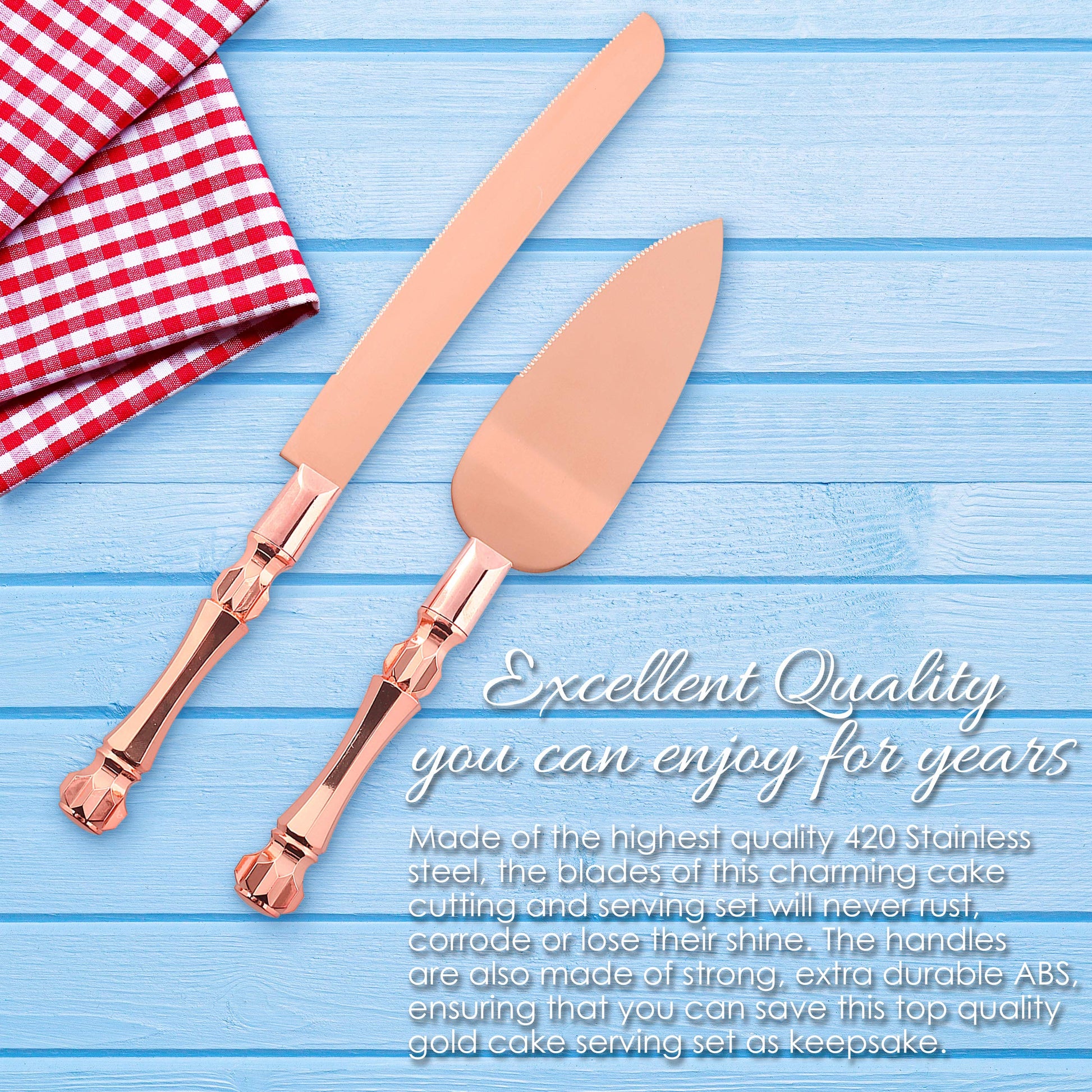 - π΄ EXCELLENT QUALITY YOU CAN ENJOY FOR YEARS - Made of the highest quality 420 Stainless steel, the blades of this charming cake cutting and serving set will never rust, corrode or lose their shine. The handles are also made of strong, extra durable ABS, ensuring that you can save this top quality gold cake serving set as keepsake!