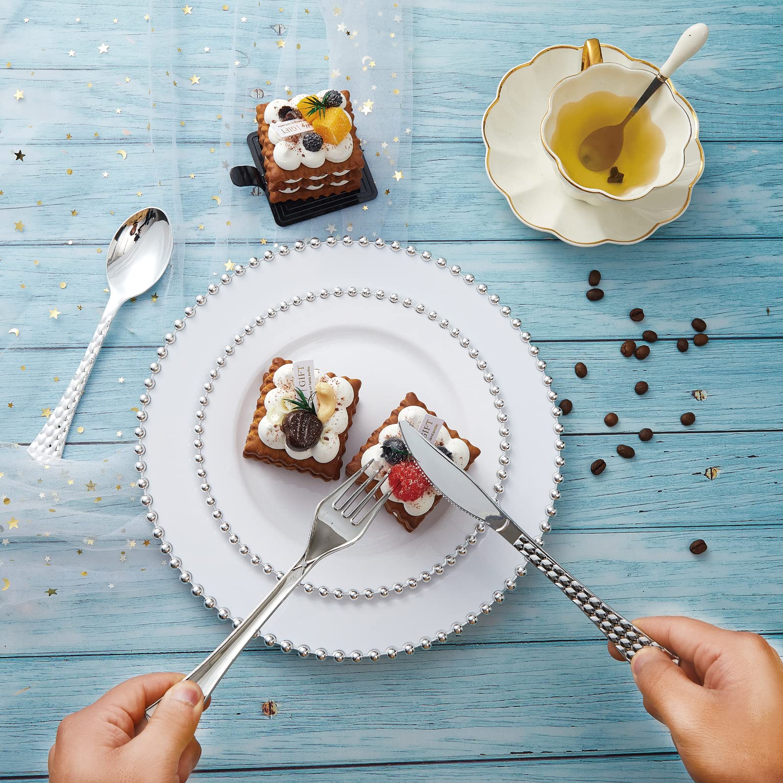 75-Piece Fancy Disposable Dinnerware Party Set, 15 Dinner Plates, 15 Dessert Plates with Silver Bead Rimed, 15 Silver Spoons, 15 Knives, 15 Forks, Plastic Silverware for Wedding Birthday Party