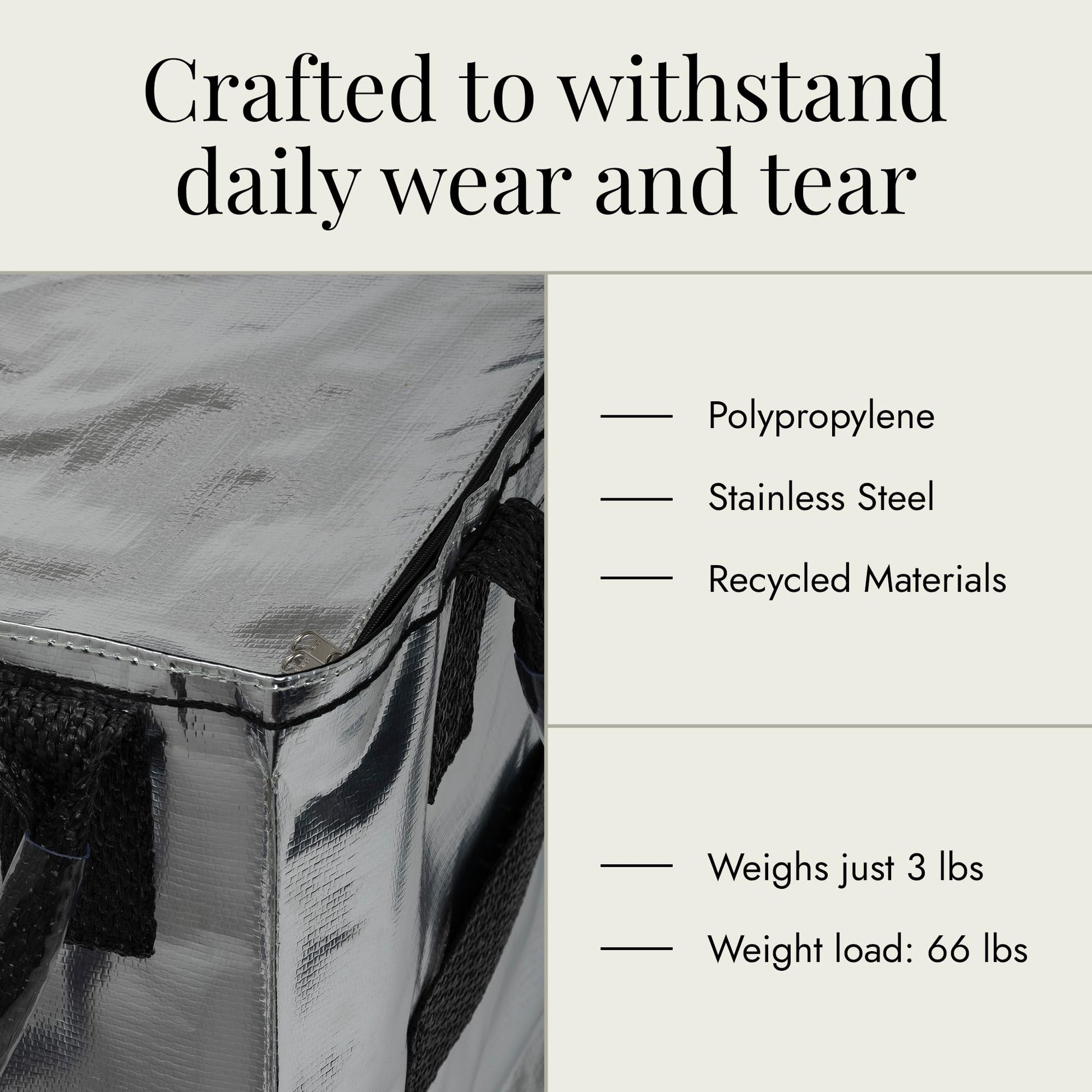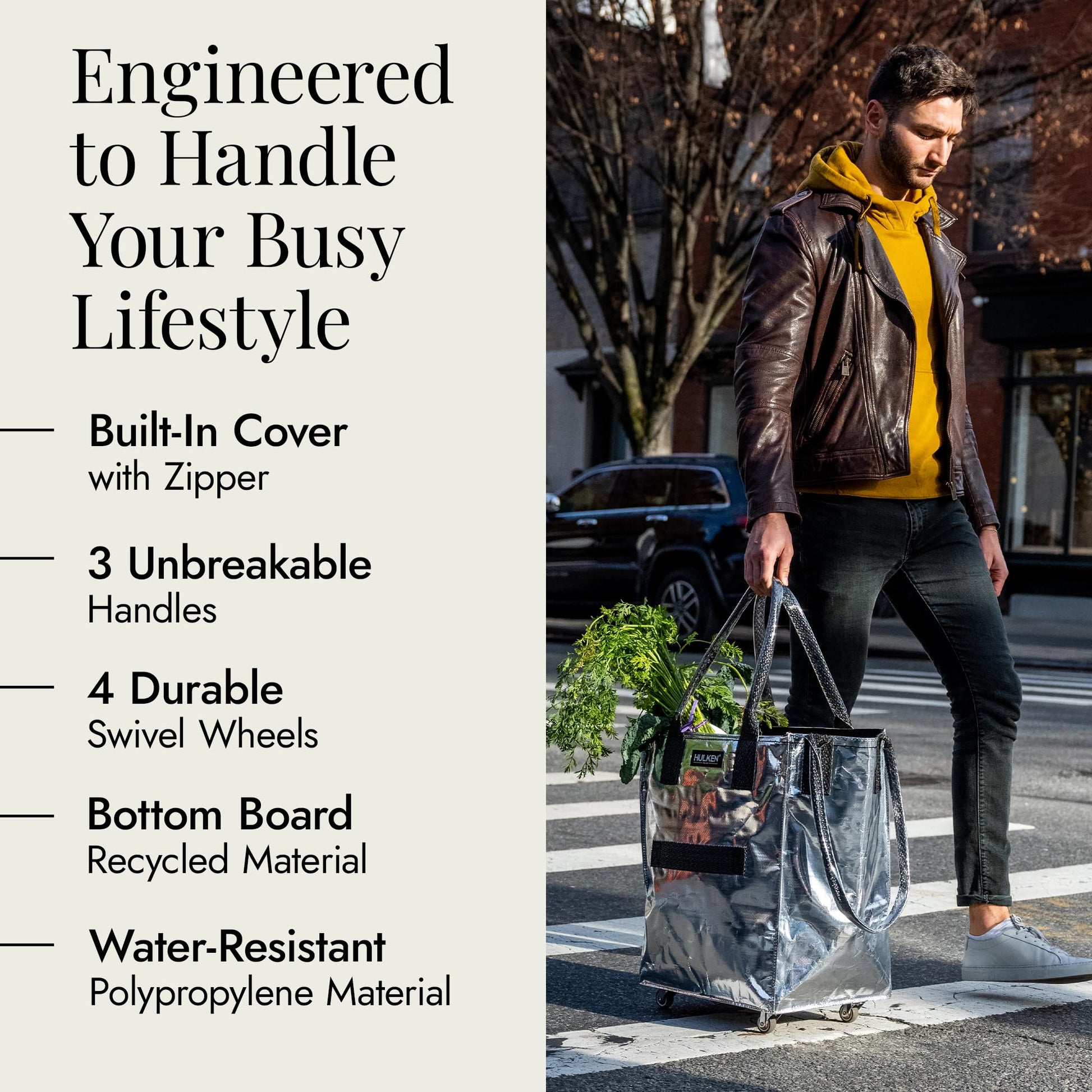 HULKEN (Medium, Silver) Reusable Grocery Bag On Wheels, Shopping Trolley, Rolling Tote, Zipper Closure, Lightweight, Carries Up to 66 lb, Folds Flat, Unbreakable Handles