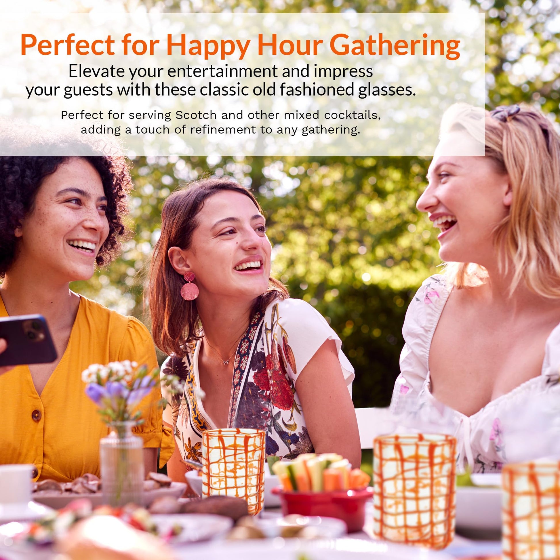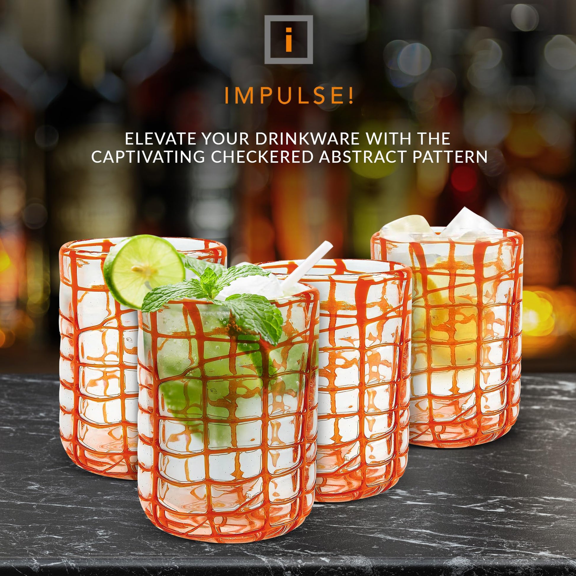 IMPULSE! Checkered Abstract Orange Drinking Glasses Set of 4 - Classic Old Fashioned, Negroni, Scotch, Mixed Cocktails - Versatile for Soft Drinks - Dishwasher Safe - Drinkware Glasses Set
