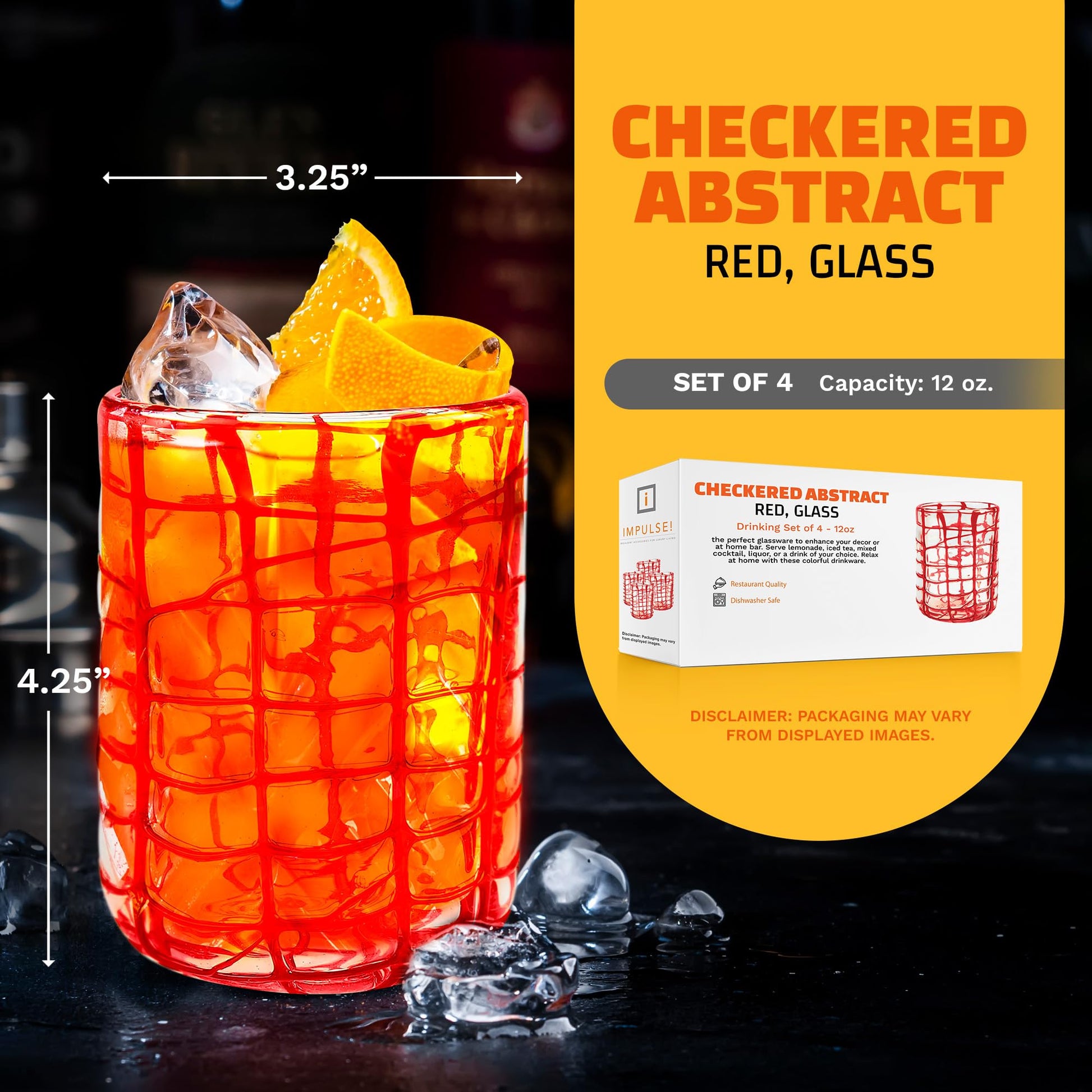 IMPULSE! Checkered Abstract Red Drinking Glasses Set of 4 - Classic Old Fashioned, Negroni, Scotch, Mixed Cocktails - Versatile for Soft Drinks - Dishwasher Safe - Drinkware Glasses Set