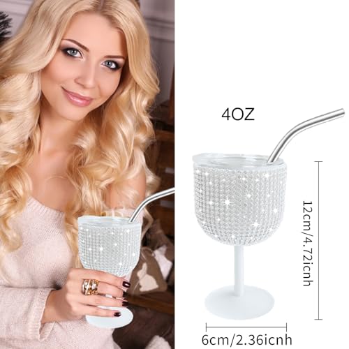 INSTOME Rhinestone Stainless Steel Wine Glasses,4oz Bling Stemmed Stainless Steel Wine Tumbler with Lid and Straw for Camping,Picnics,Travel,Birthday Gifts for Family (silver, 4oz)