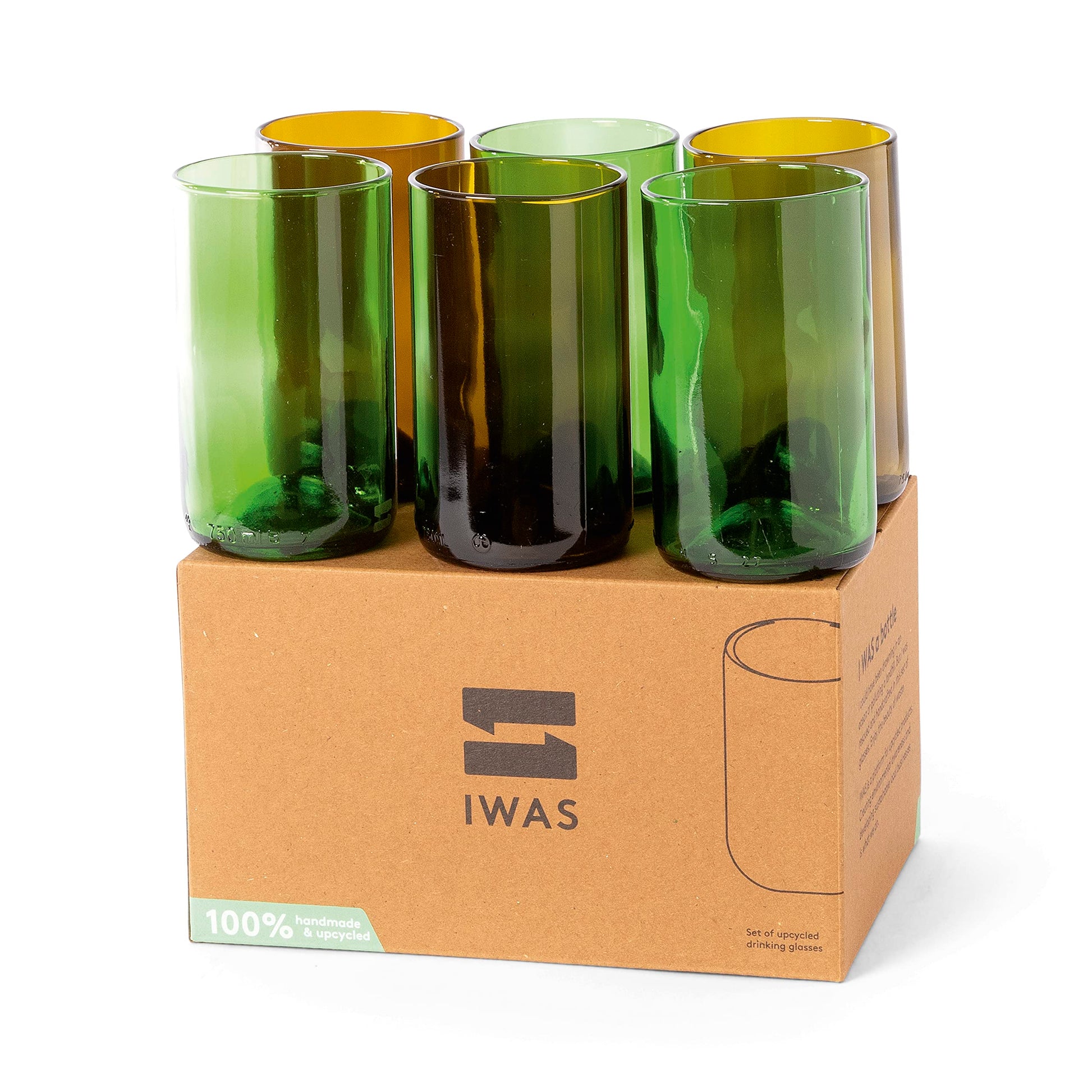 IWAS Upcycled Tall Drinking Glasses | 400 ML | 13.53 OZ | Set of 6 | Sustainable Water and Cocktail Glasses For Home | Environmentally Friendly Olive Green Glasses