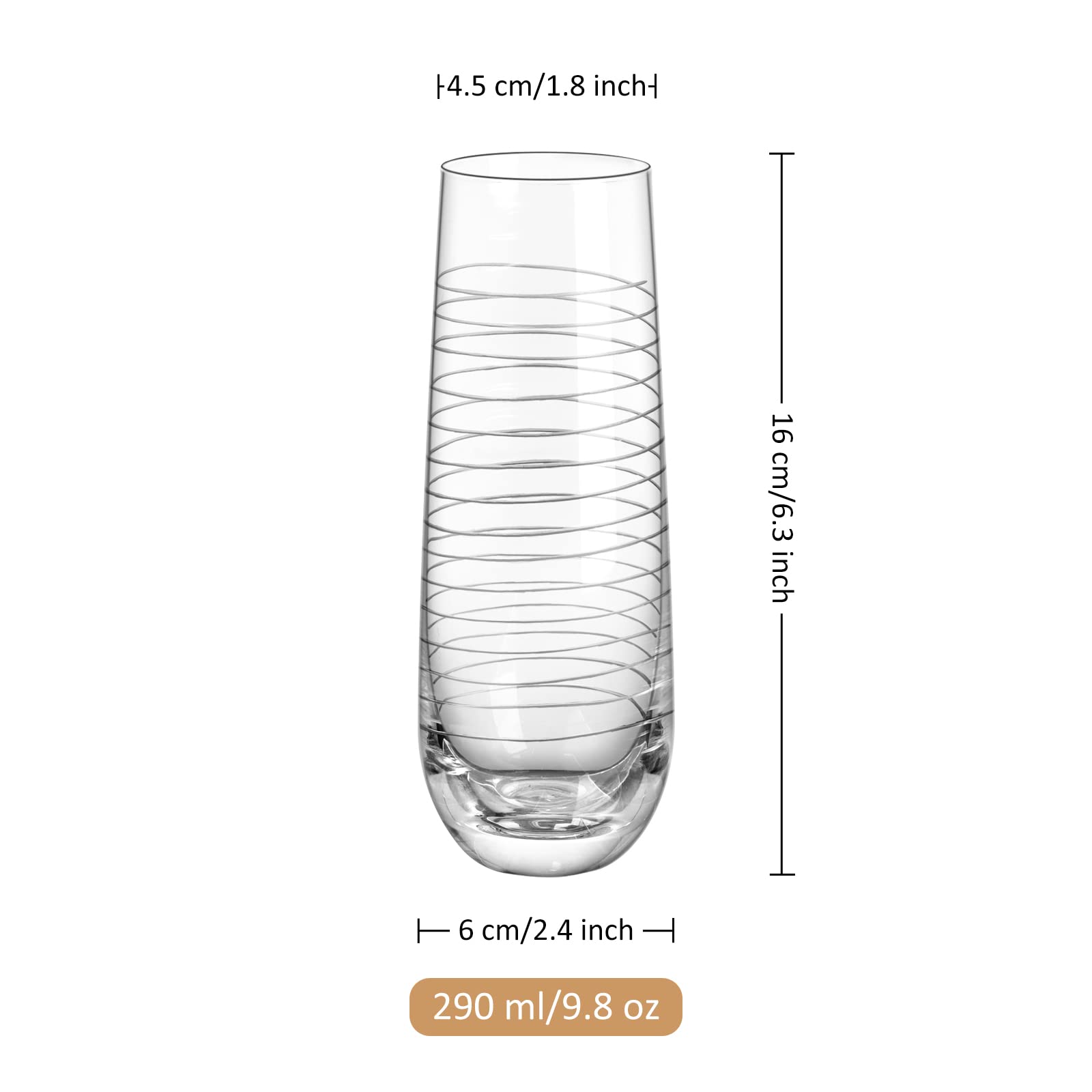 - Specifications and Notes: For this etched champagne flutes glass cup set, the height is around: 6.3"/16 cm, the top diameter is around: 1.8"/4.5 cm, the capacity is about 290 ml/9.8 oz. Packing Includes: 4 units with 4 geometrical designs: dots, swirls, crossed lines, strips. Simple but sophisticated and classic.