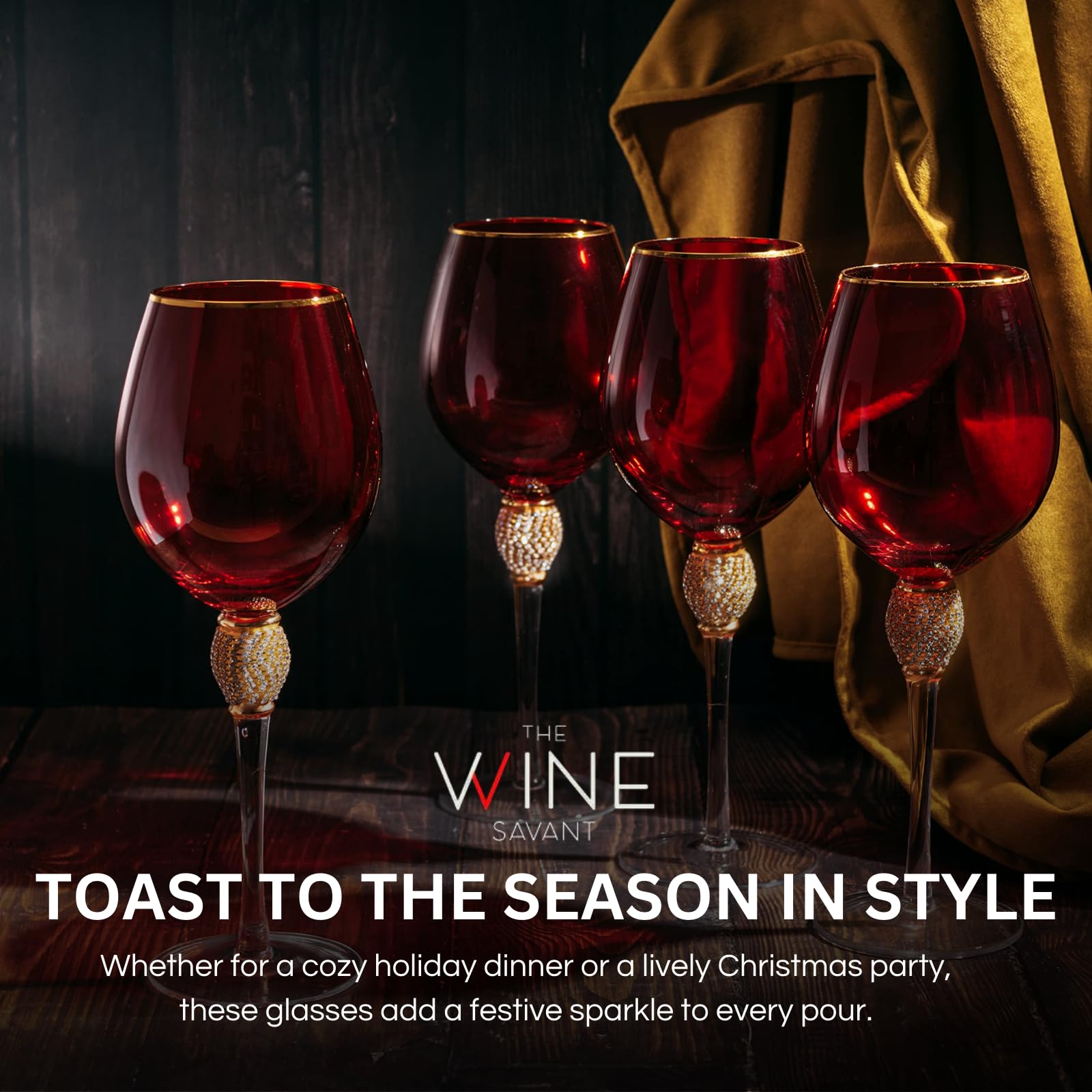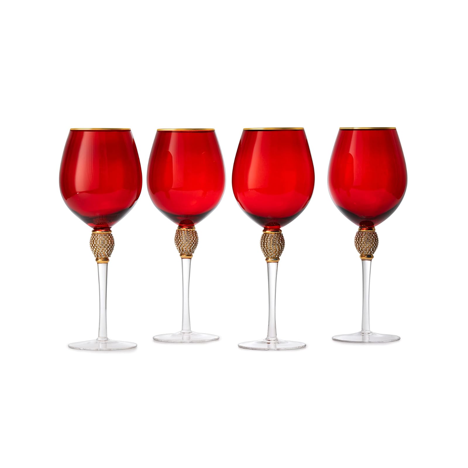 - The Wine Savant adds glamor to your table with this elegant diamond-shaped stem and red hue. Each glass is rimmed in gold, creating an understated luxury that enhances any occasion. Our borosilicate wine glass set of 4 is the perfect gift for anyone who enjoys a fine wine. Each glass has a diameter of 3.75", a height of 10", and holds 18 oz. The versatile glassware is the perfect accompaniment to any occasion and will surely add a touch of elegance to your table settings.
