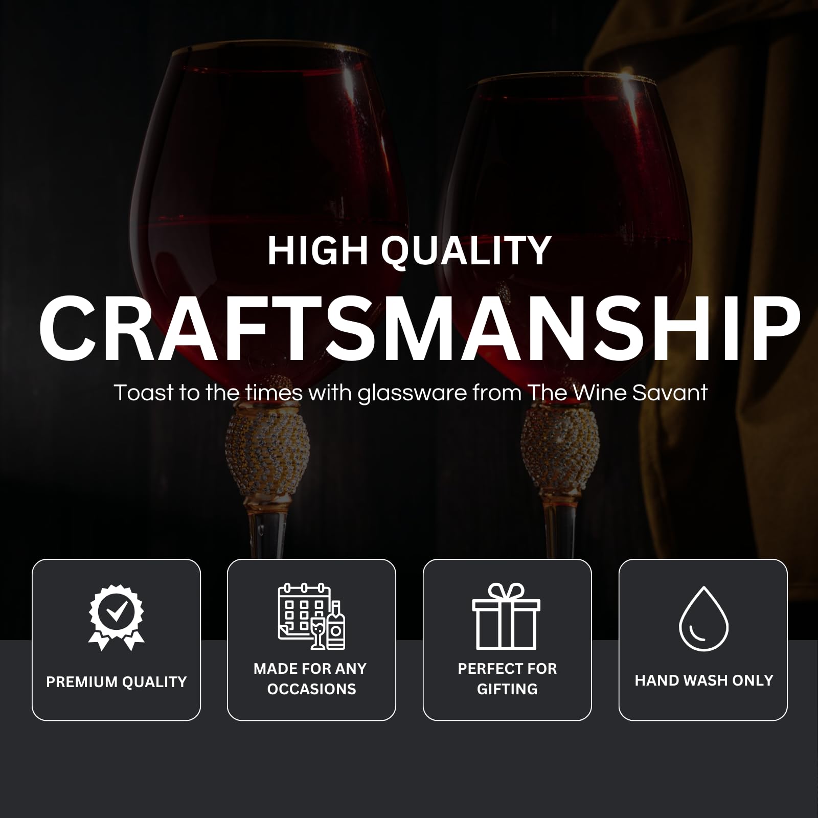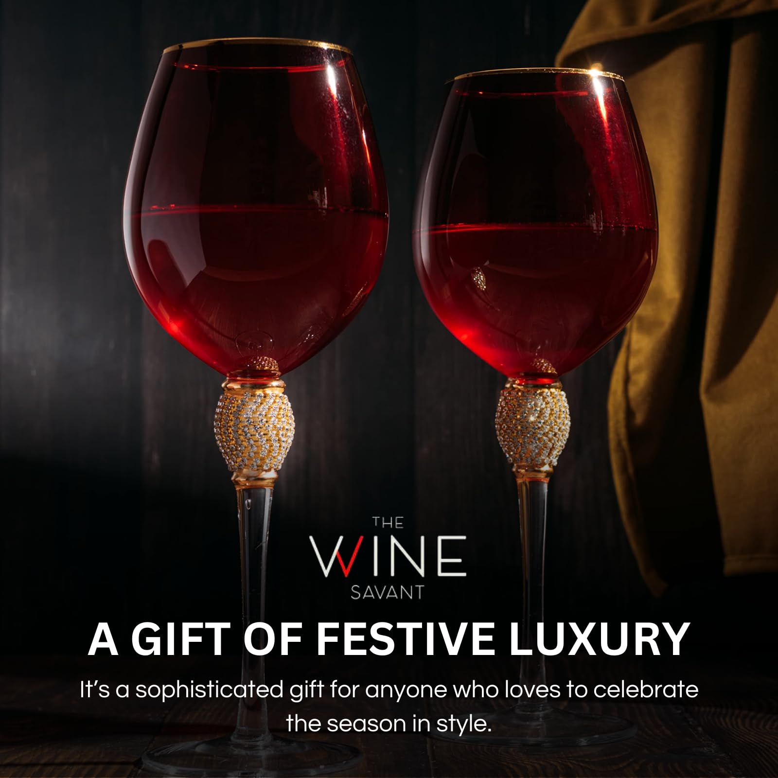 Large Red Diamond Wine Glasses, Christmas, Holiday, & Weddings, 10" H Gold Rim Rhinestone DIAMOND Studded Glasses - Wedding Glasses - 18oz, Premium Bling Designed Glassware, Crystal Long Stem Glass